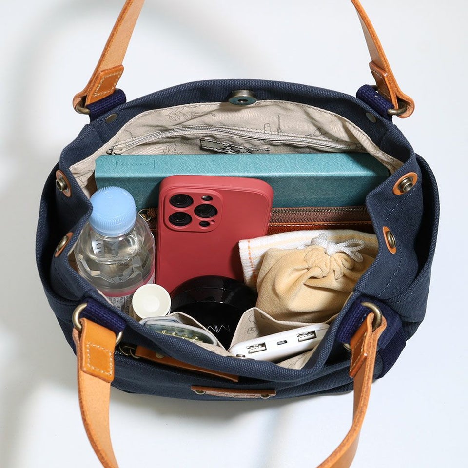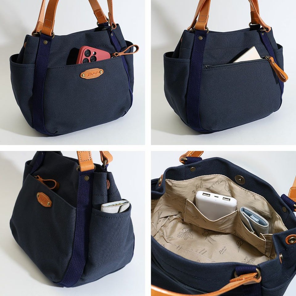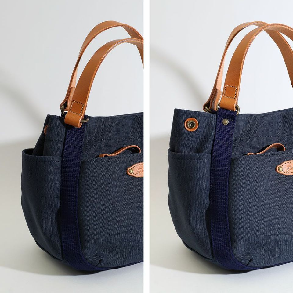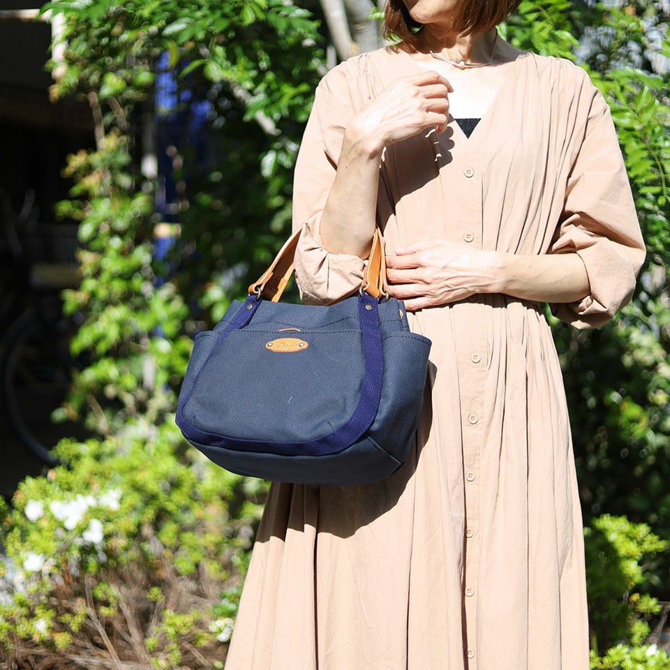 サイドのスナップボタンで2フェイス仕様に。ちょっとしたお出かけに最適な2フェイスミニトートです。小ぶりな見た目ながら、マチ幅がしっかりあるので、長財布やペットボトル、手帳などが楽に入ります。