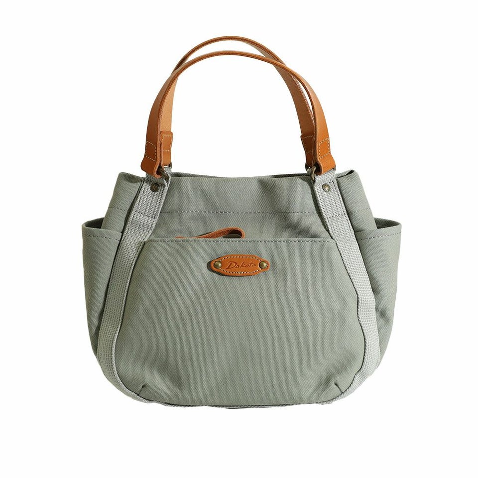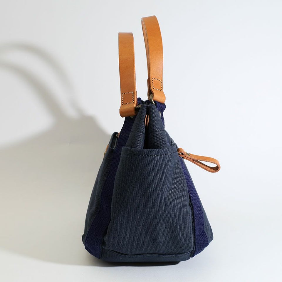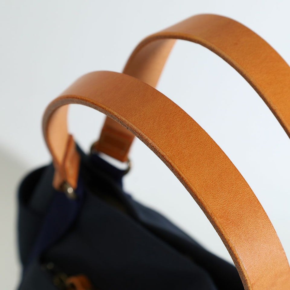 帆布生地で仕立てたデイリーバッグです。ハンドルやブローチに厚ヌメ革をあしらうことで、よりカジュアルに仕上げました。飽きの来ないシンプルデザインで、オールシーズン活躍してくれます。