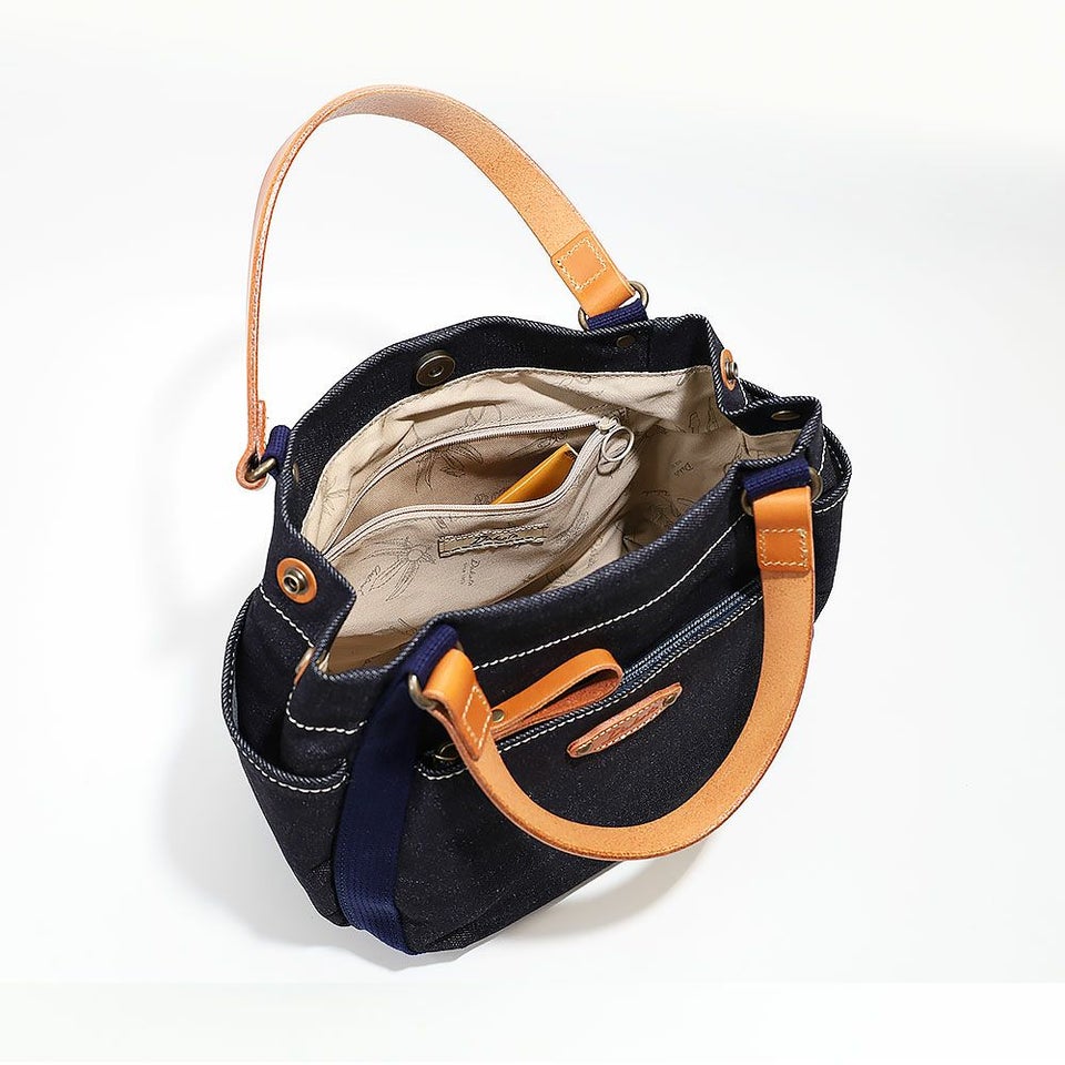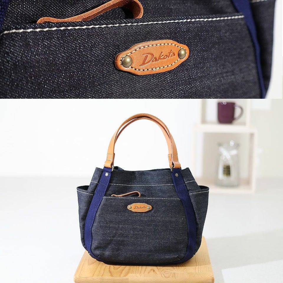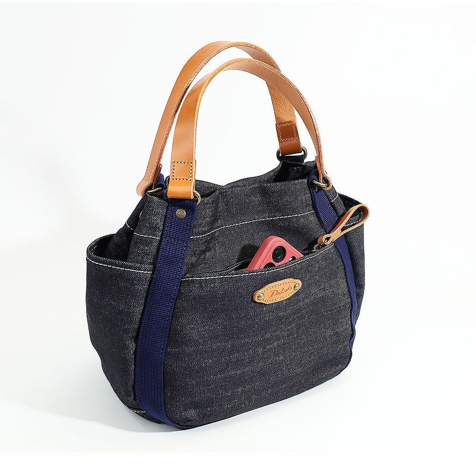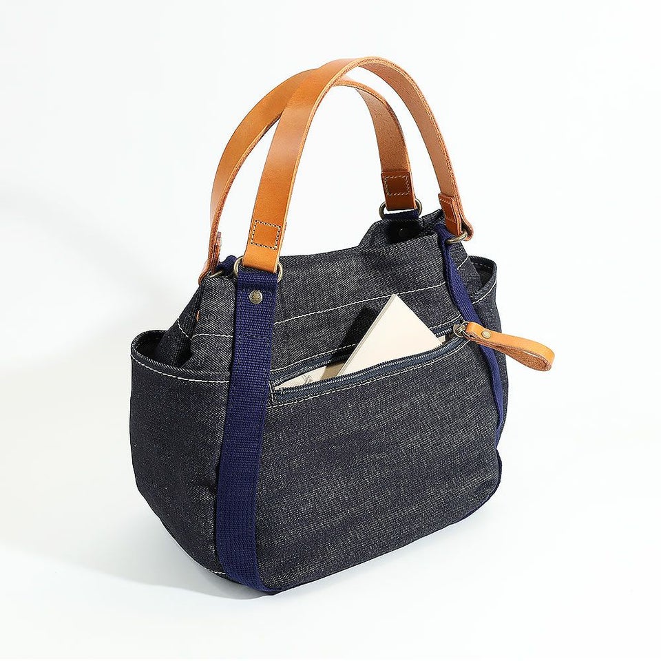 本体は軽やかなデニム生地、ハンドルやブローチには厚ヌメ革を使用。飽きの来ないシンプルデザインで、オールシーズン活躍してくれます。