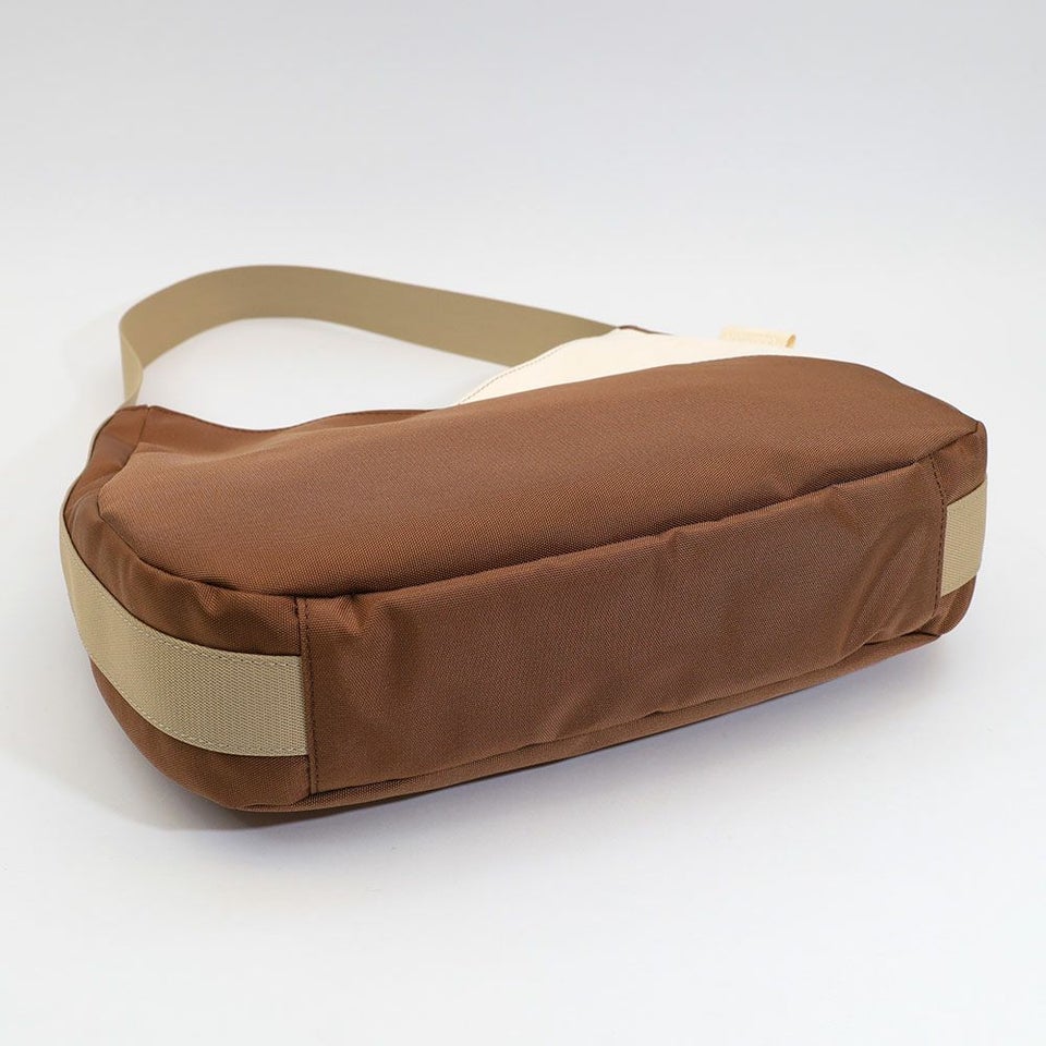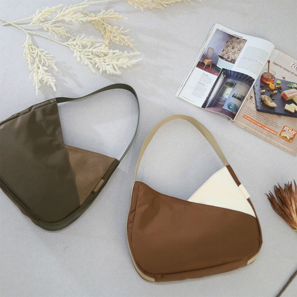 前面にスエード調素材、背面にナイロン素材を組み合わせた異素材デザイン。控えめなバイカラーとシャープな斜めの切り替えラインが洗練された印象を演出します。
