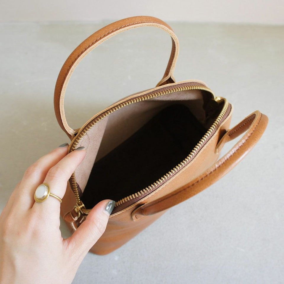 柔らかで光沢のある質感と華奢なハンドルが上品なミニサイズのボストンバッグ。