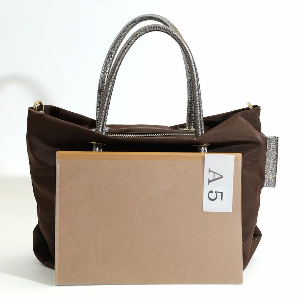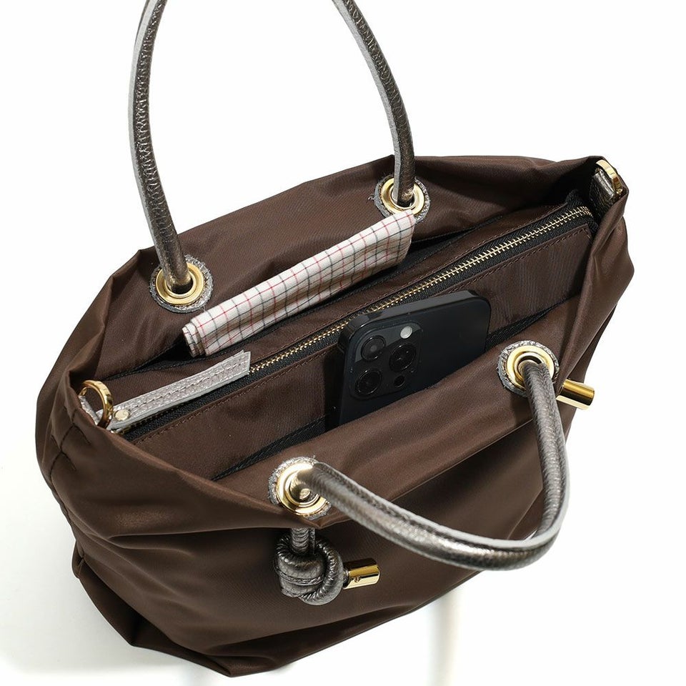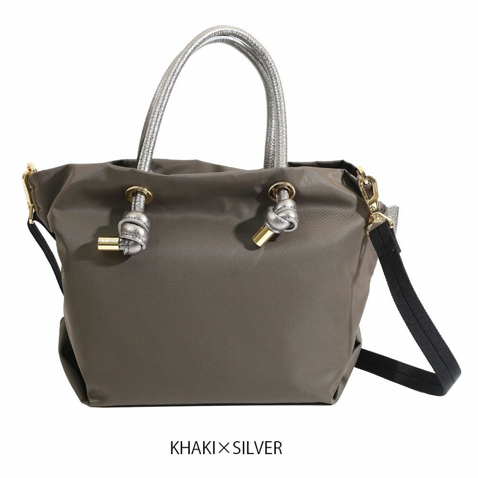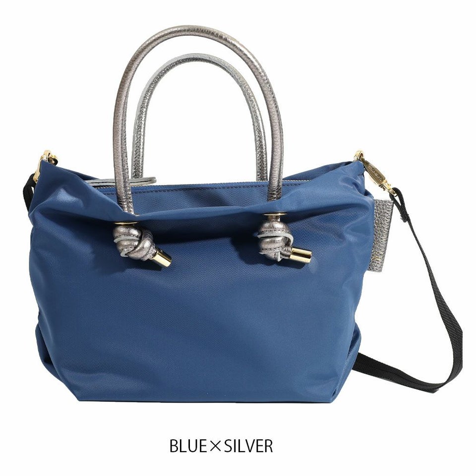 シンプルなデザインのボディにメタリックレザーのノットハンドルがアクセントになったトートバッグのSサイズ。 内側は3層に分かれており、ファスナーを閉めたままアオリポケットにスマホやパスなどを収納できるので通勤などで安心してお使い頂けます。 長財布やペットボトルなどが収納でき、ショルダーストラップ付きの2WAY仕様です。 弱撥水性があるのでお手入れも簡単で、軽量なのも特徴です。