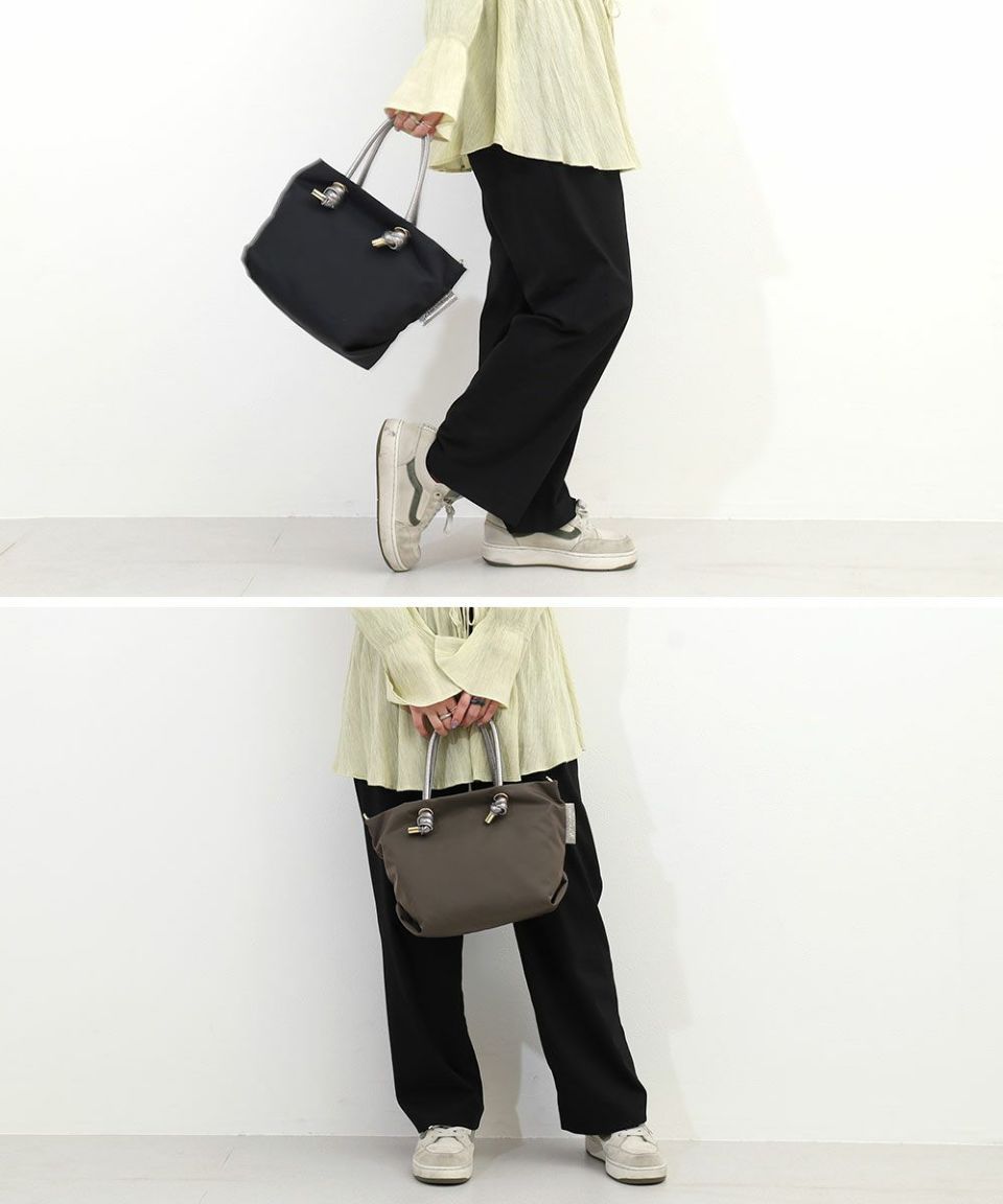シンプルなデザインのボディにメタリックレザーのノットハンドルが