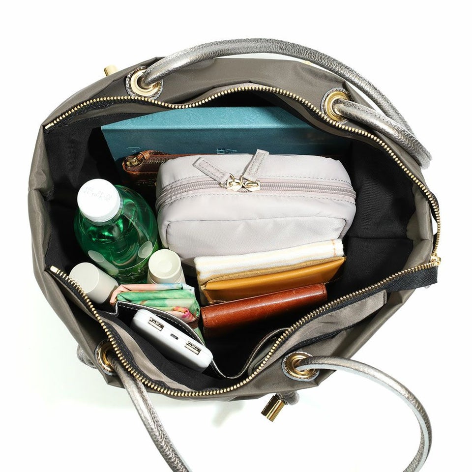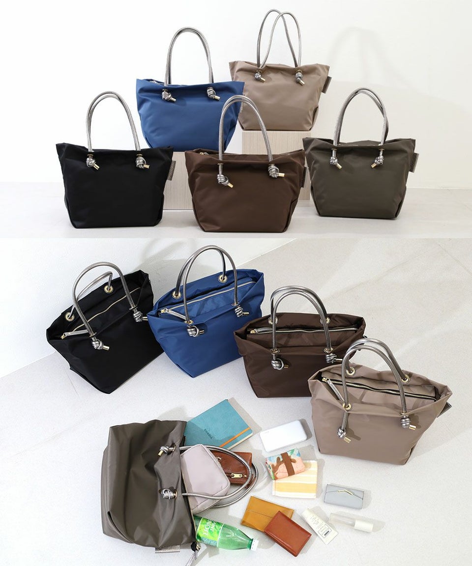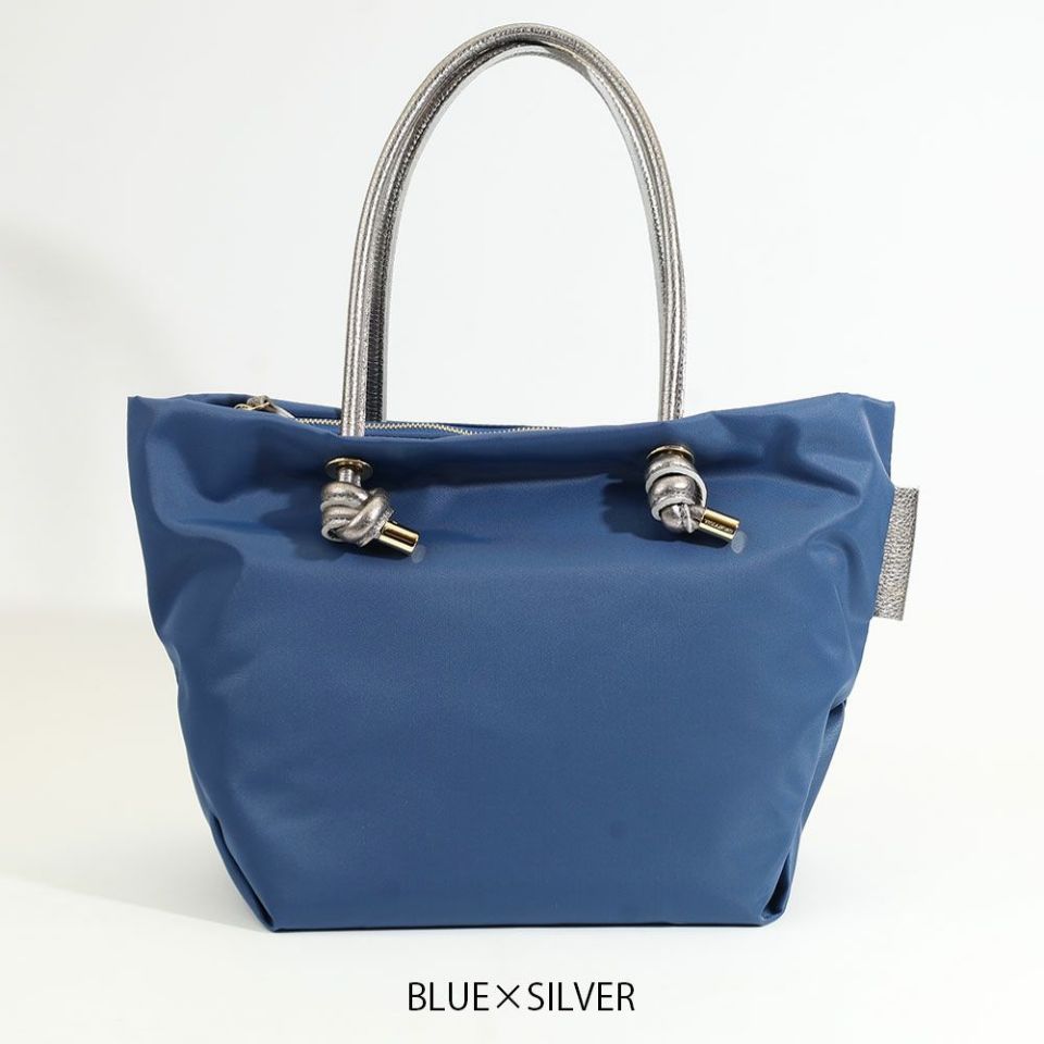 シンプルなデザインのボディにメタリックレザーのノットハンドルがアクセントになったトートバッグのSサイズ。 内側は3層に分かれており、ファスナーを閉めたままアオリポケットにスマホやパスなどを収納できるので通勤などで安心してお使い頂けます。 長財布やペットボトルなどが収納できます。 弱撥水性があるのでお手入れも簡単で、軽量なのも特徴です。