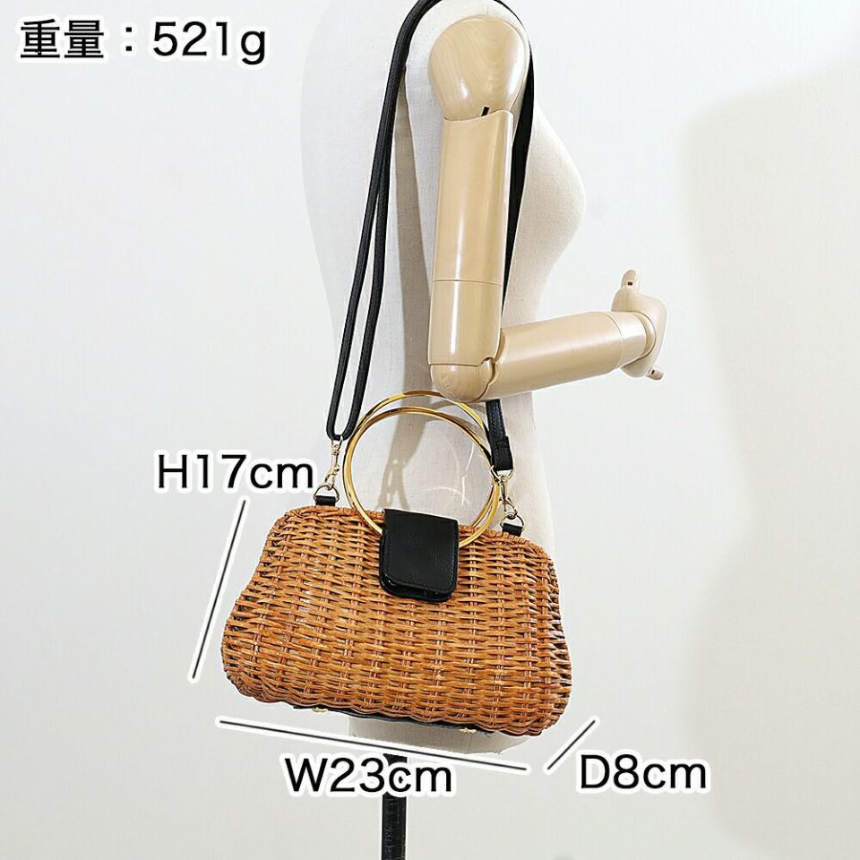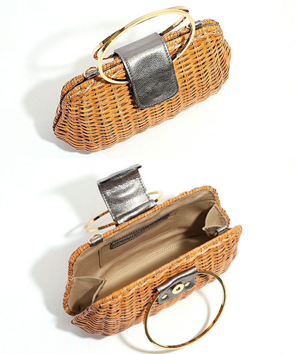ゴールドリングのハンドルがアクセサリーライクなラタンのバッグ