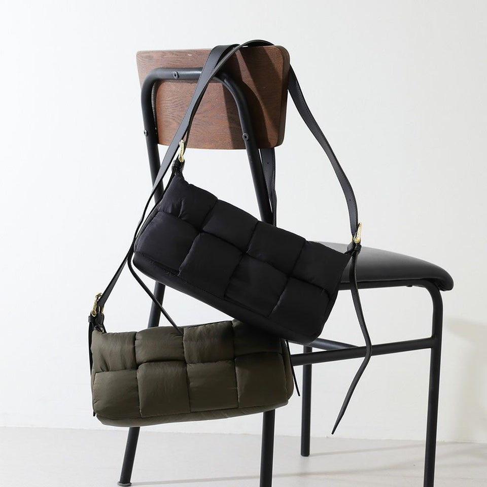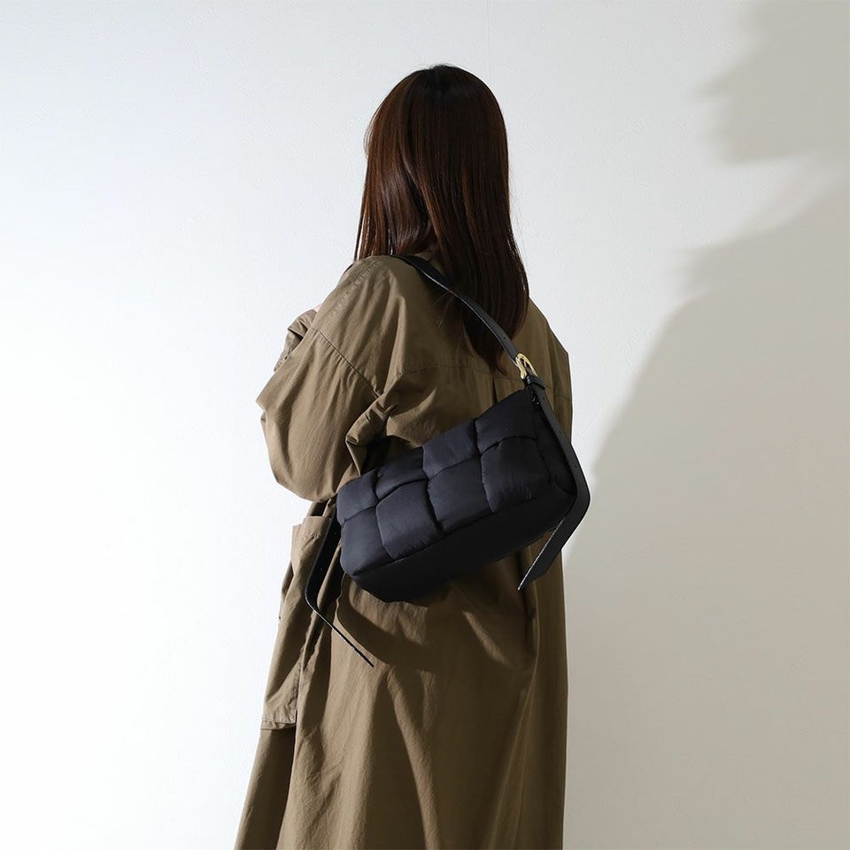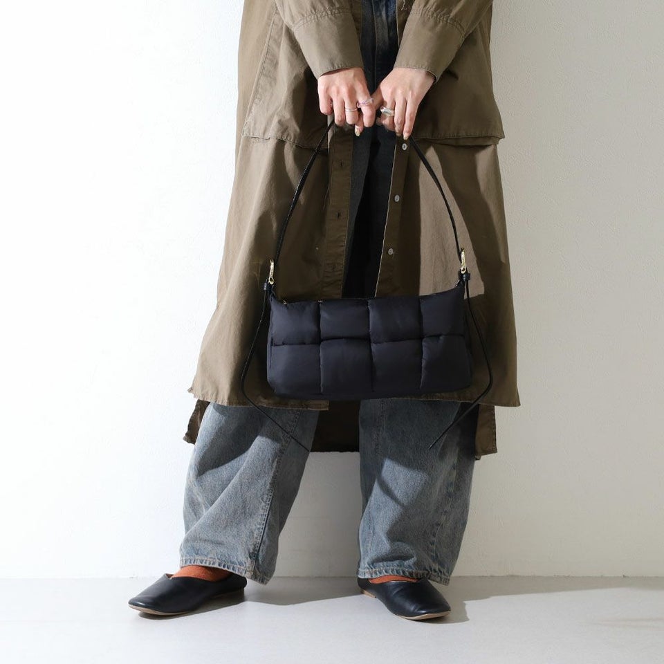 テープ状のナイロンを組み合わせた個性的なボンディング仕様。シンプルながら立体感のある表情が、コーディネートに程よいアクセントを加えます。