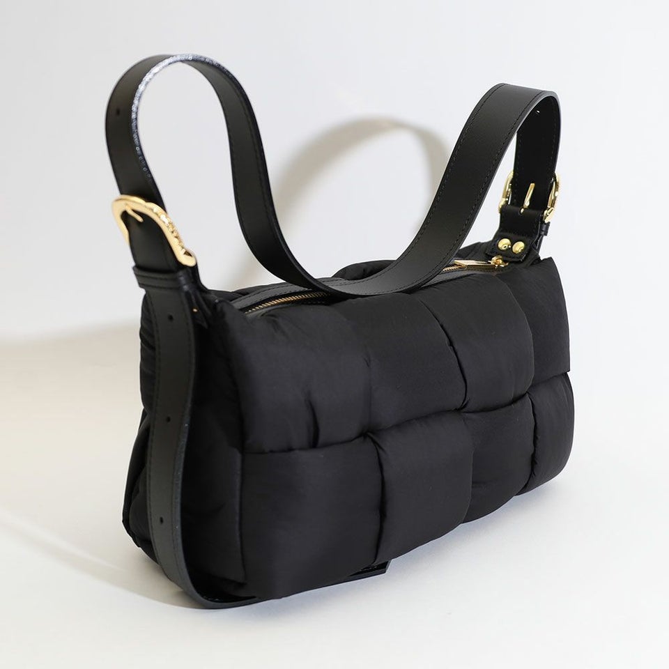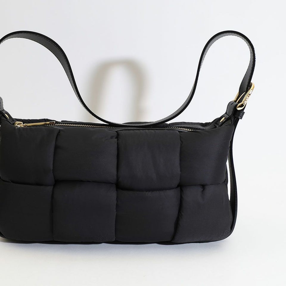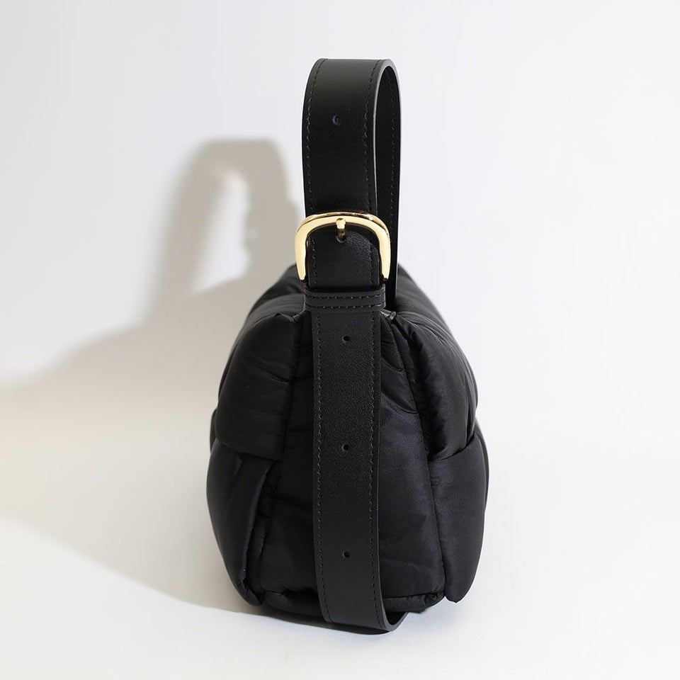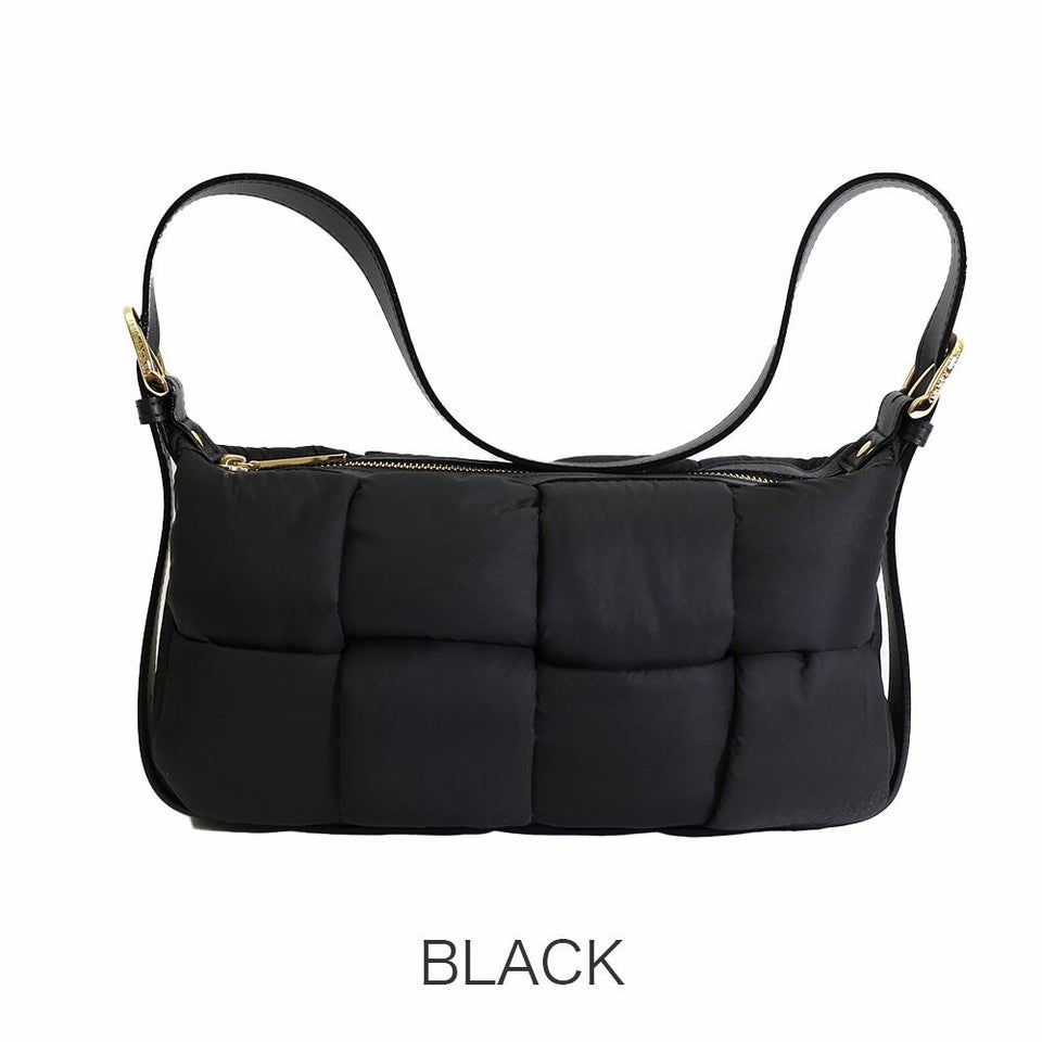 テープ状のナイロンを組み合わせた個性的なボンディング仕様。シンプルながら立体感のある表情が、コーディネートに程よいアクセントを加えます。