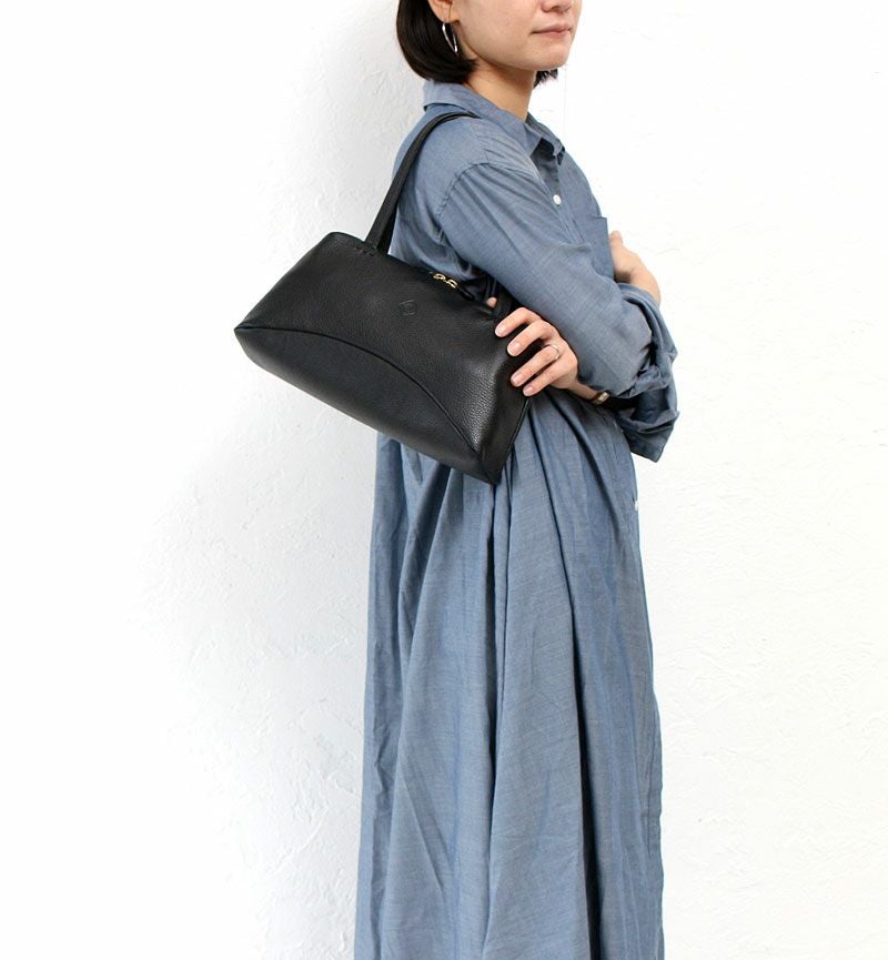 シンプルなデザインながら温かみを感じる持ち手付け根のステッチや、 バッグ下部縫込みによる滑らかな曲線がアクセントとなり、控えめに個性を放つ一品に仕上がりました。