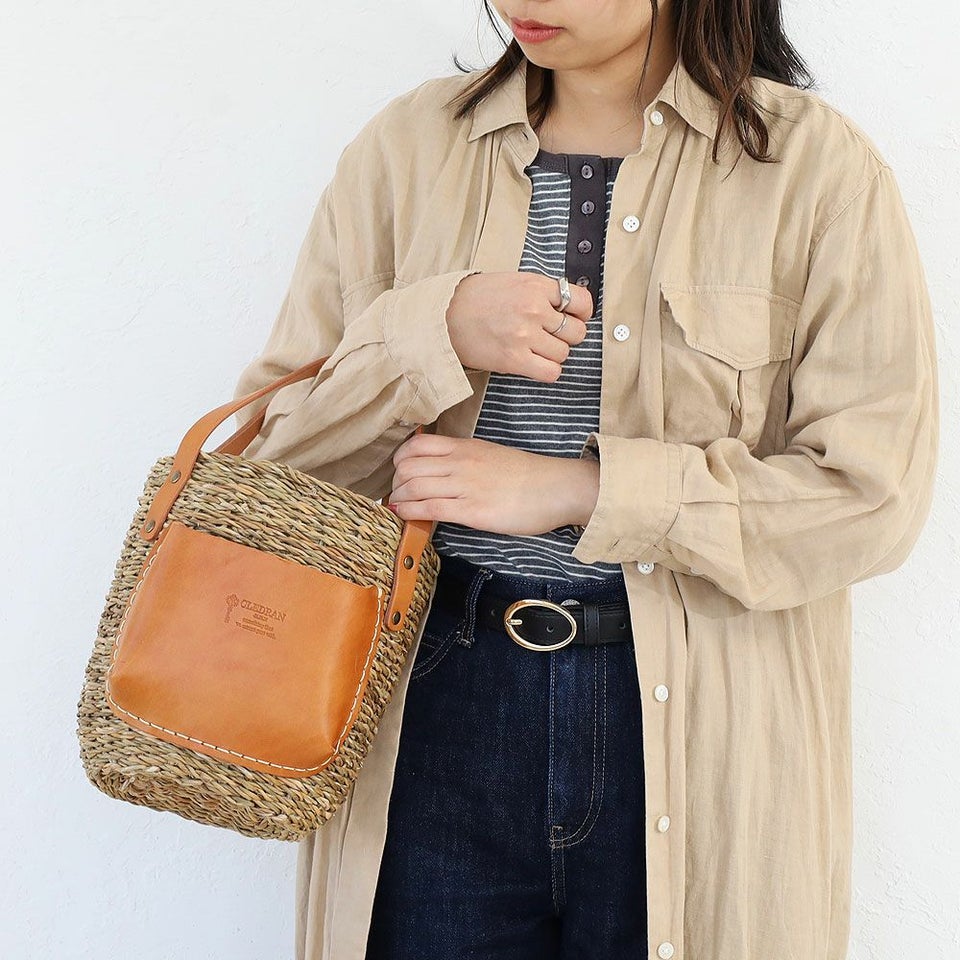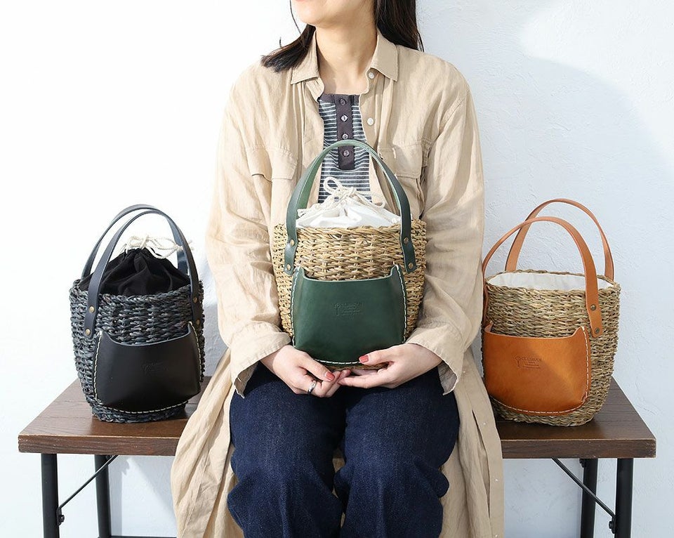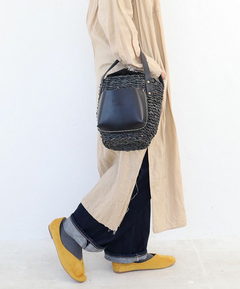 ナチュラルなカゴにレザーを合わせることで上品さをプラス。