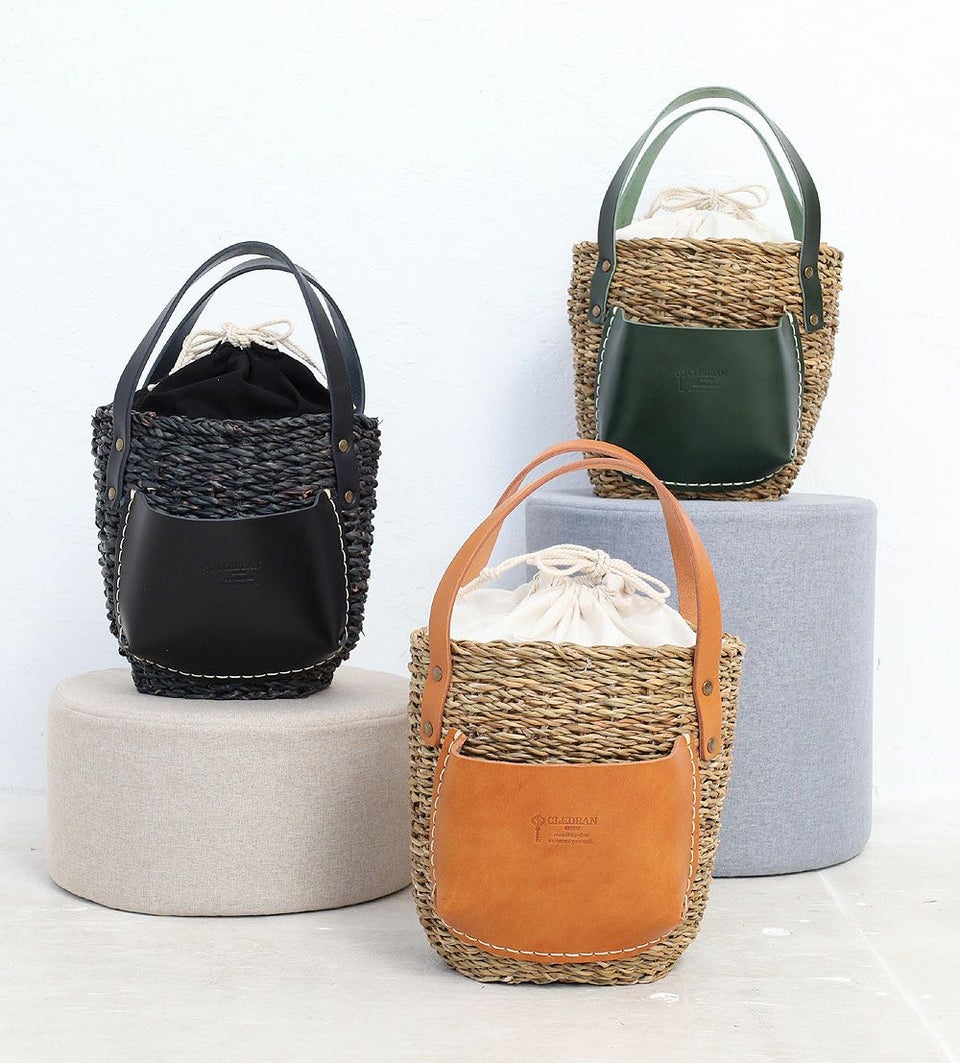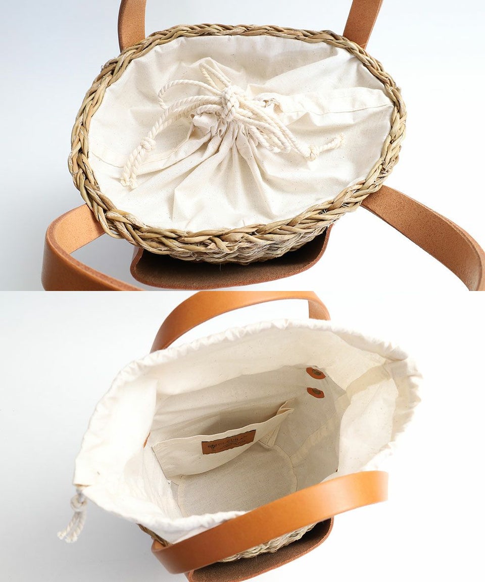 天然繊維を染色し、手作業で一つひとつ編み込んでいるため、カゴ本体の色の濃淡・素材の割れ、