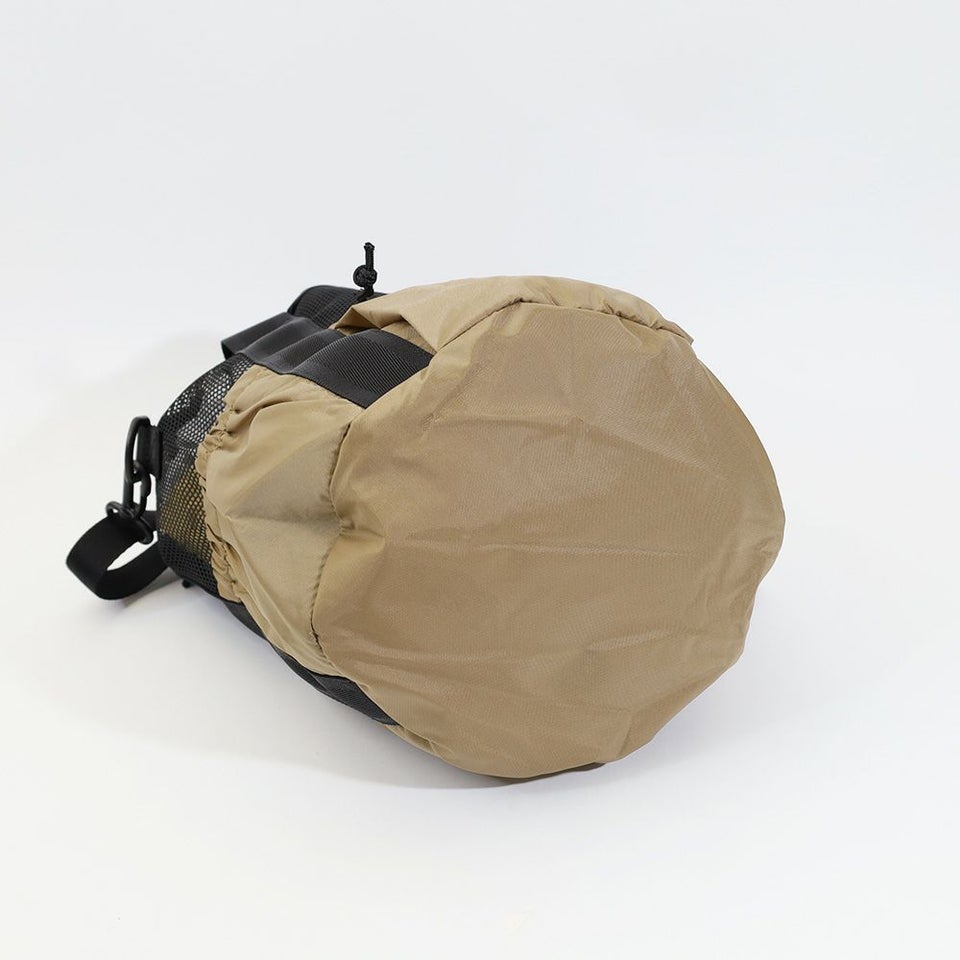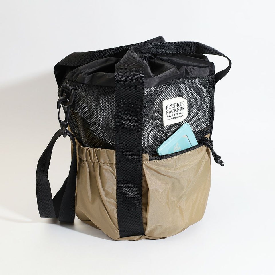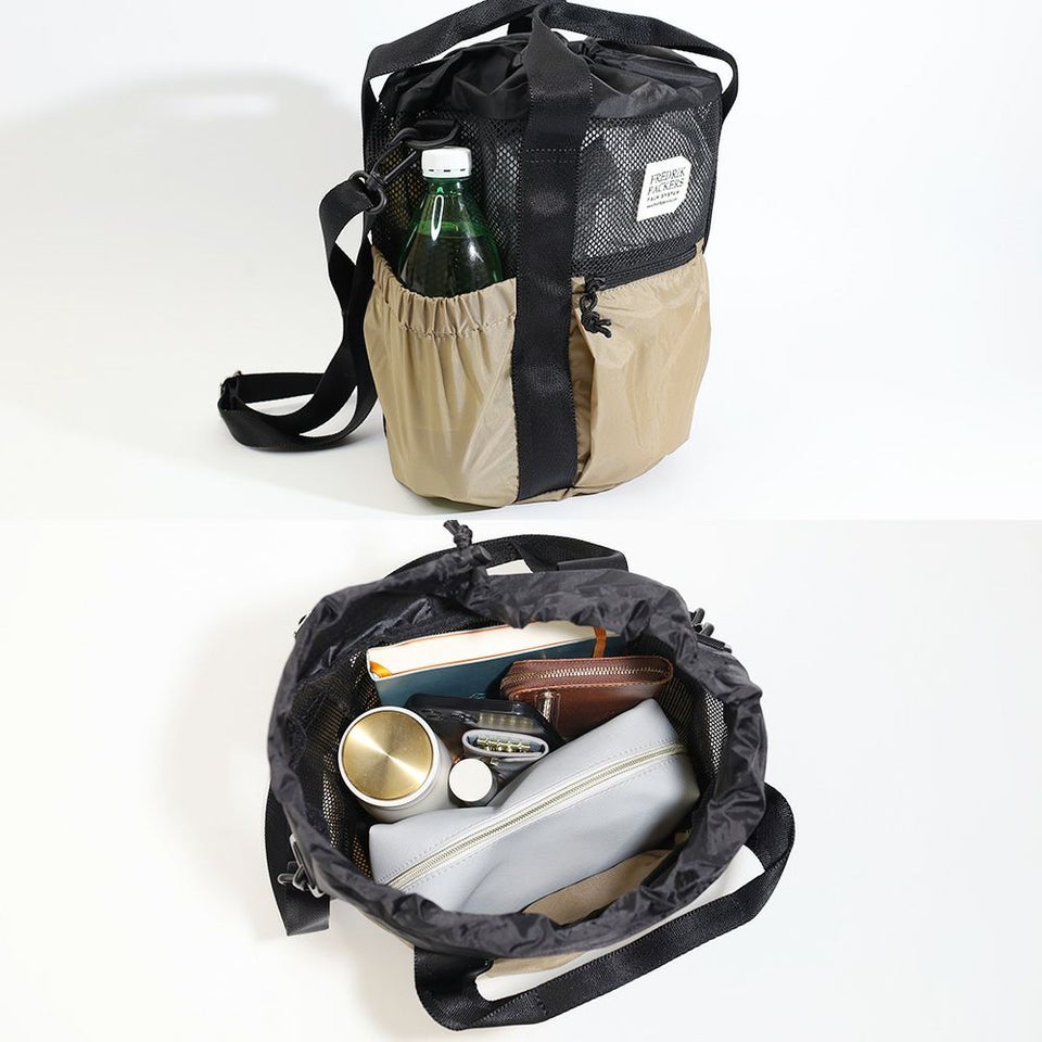ドローコードで開閉できる巾着構造は、大きく開くことで中身が見やすく、荷物の出し入れもスムーズ。普段使いにちょうどいいサイズ感です。
