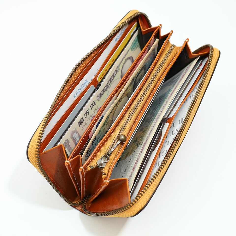 お札入れは3つに分かれており、紙幣を種類別に整理可能。小銭入れは開閉しやすいL字ファスナー仕様で、カードも16枚収納できる実用的な設計です。