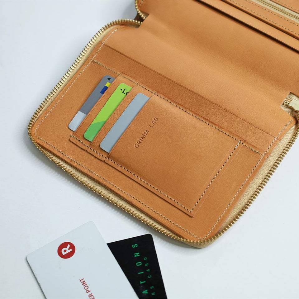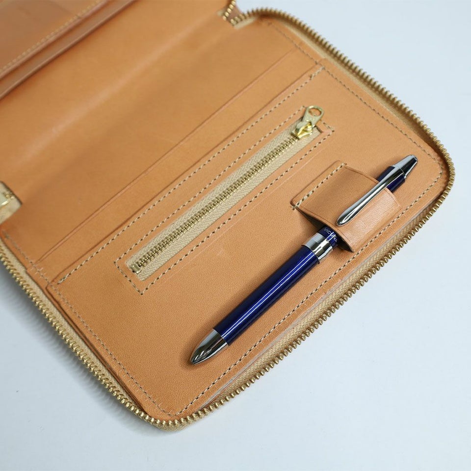 小銭や三つ折りのお札など、大切な小物を収納できるファスナーポケット付。