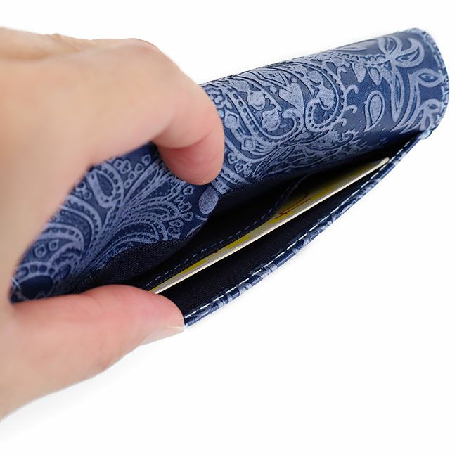 手染めで染色された藍染めレザーに、ペイズリー柄の型押しを施しています。