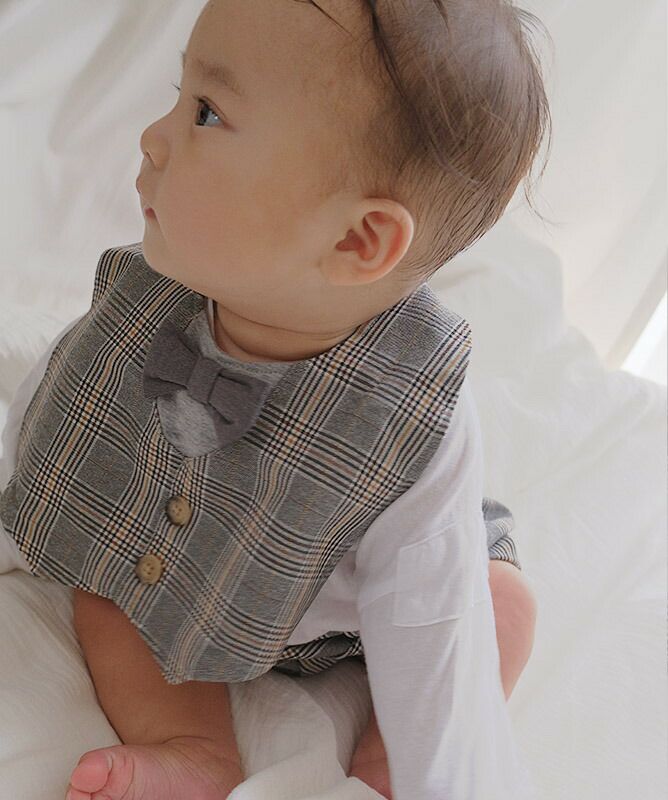 お食い初め(100日祝い)や1歳のお誕生日などの記念日をはじめ、結婚式などのお呼ばれシーンにもぴったりの蝶ネクタイ付きフォーマルベストスタイとかぼちゃパンツのセット。