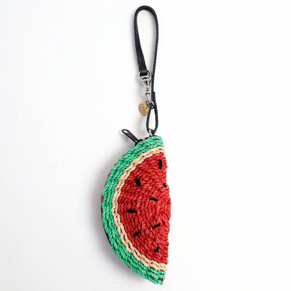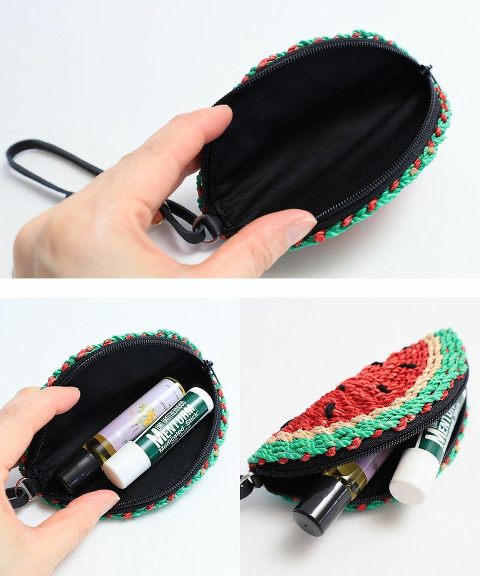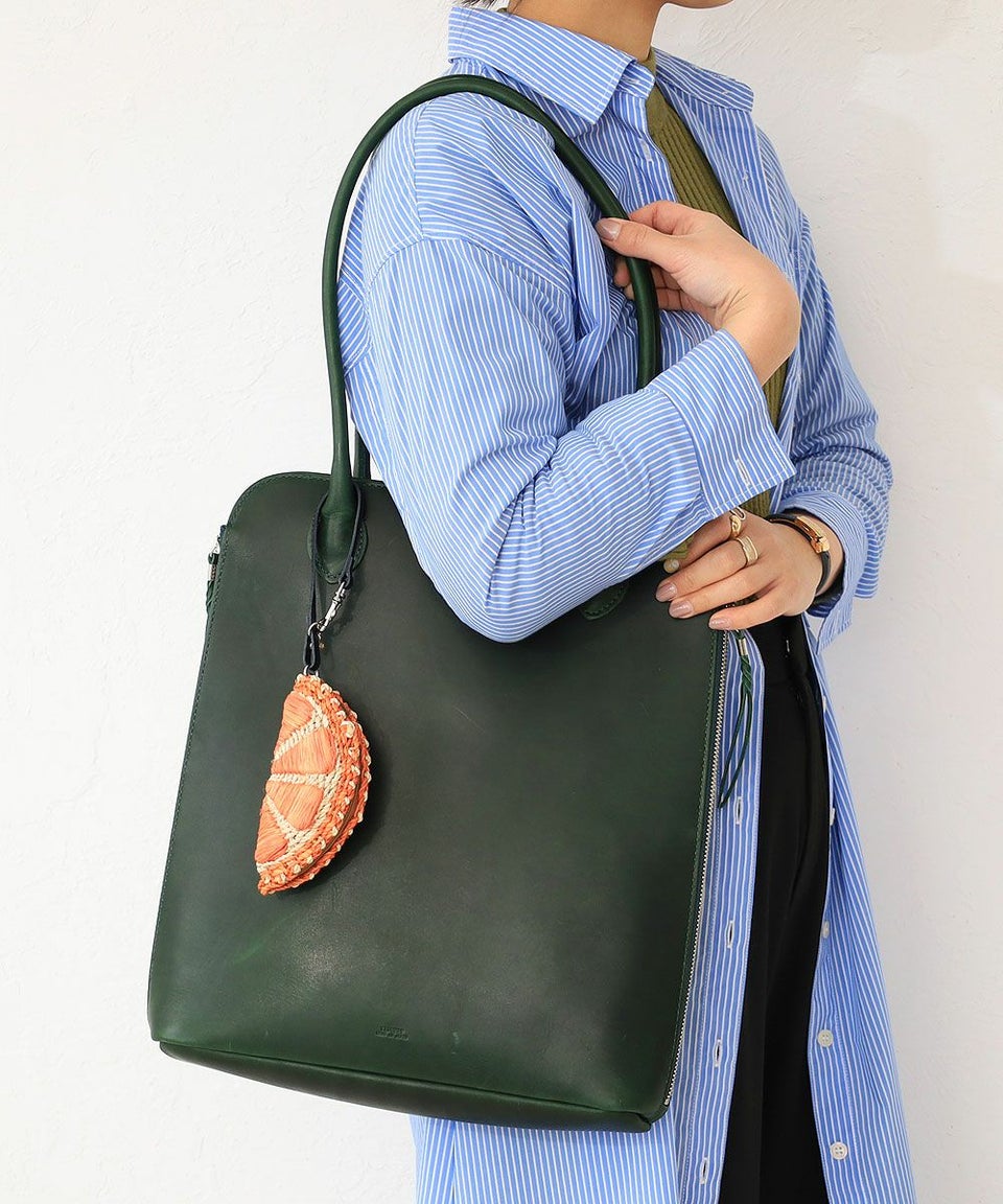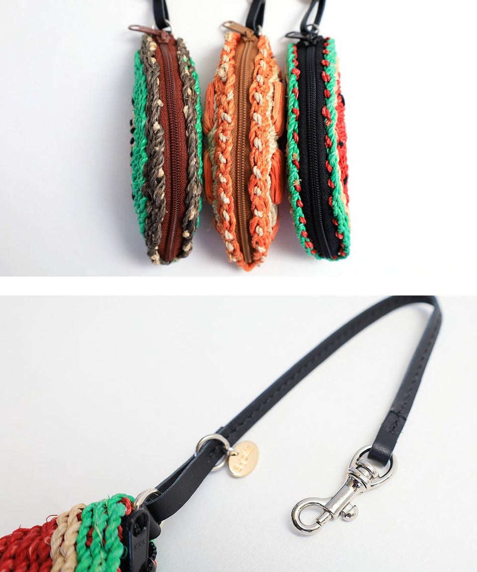 小物が入るアバカ素材のチャームはバッグのハンドル部分などに取りつけてお楽しみいただけます。