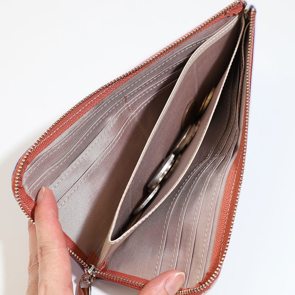 サイズは約19.5×9.5センチ。バッグに収まりやすく、長財布として必要な収納力も備えています。日常使いはもちろん、きれいめなシーンにも取り入れやすい、バランスの取れたサイズ感です。