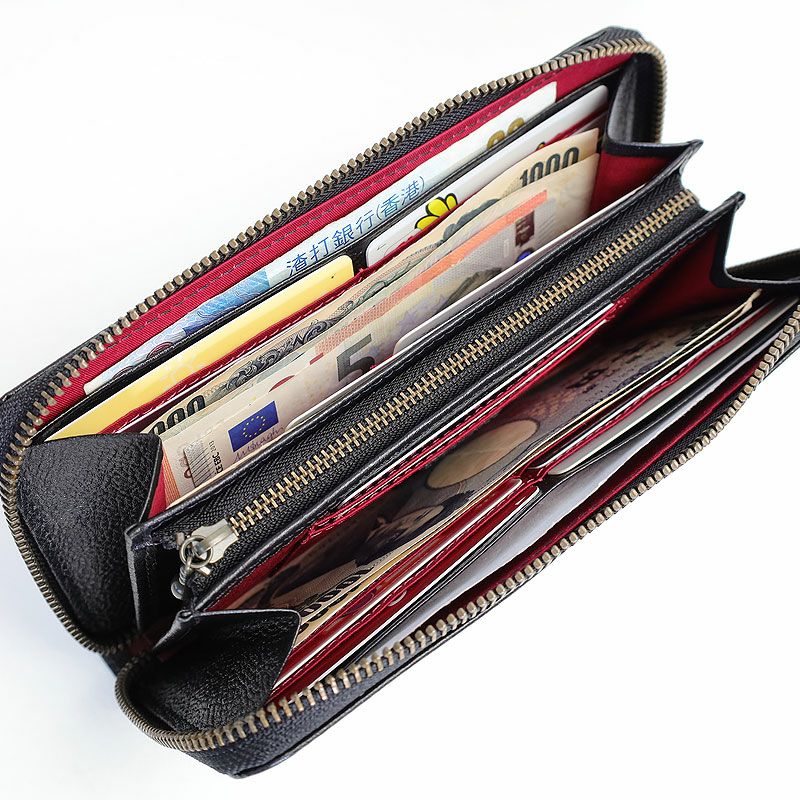 大きく開いて収納力も抜群の、ラウンドファスナータイプの長財布。