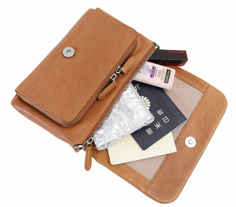 開閉部分をすっぽり覆う、フラップタイプのお財布ショルダー。