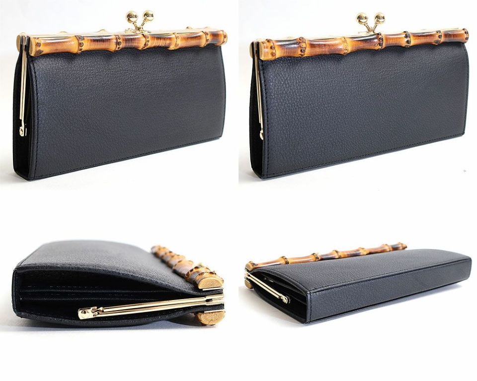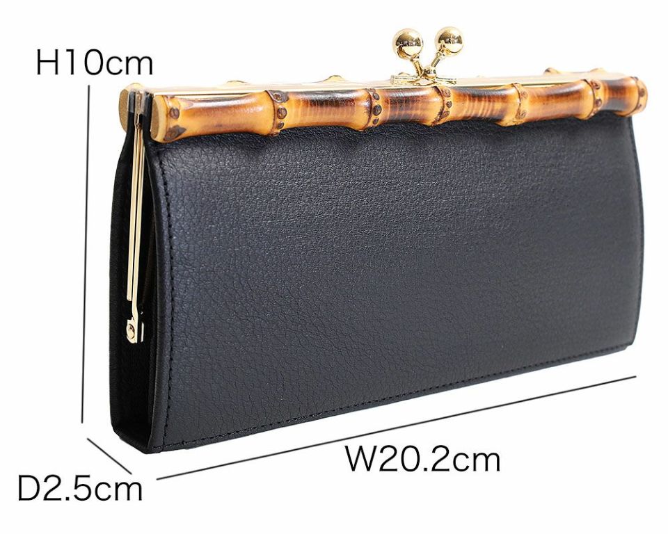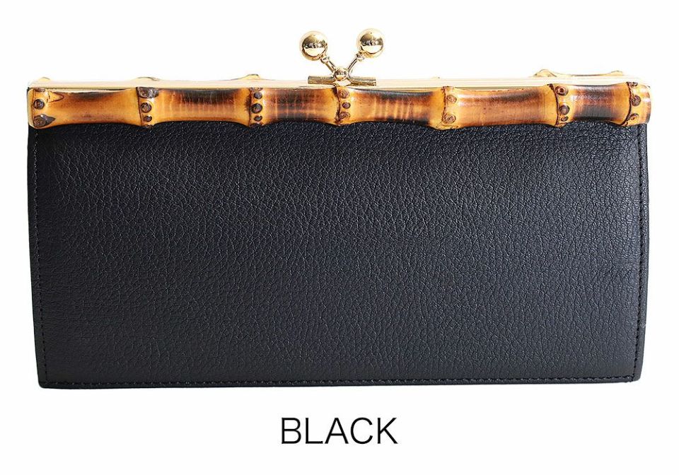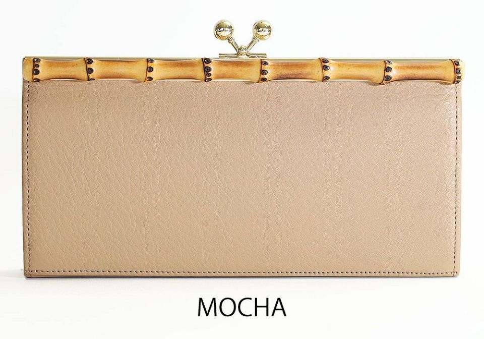 マチのあるスクエアフォルムのボディに、味わいのあるバンブーとがま口のゴールドが引き立つクラシカルな印象のウォレットです。