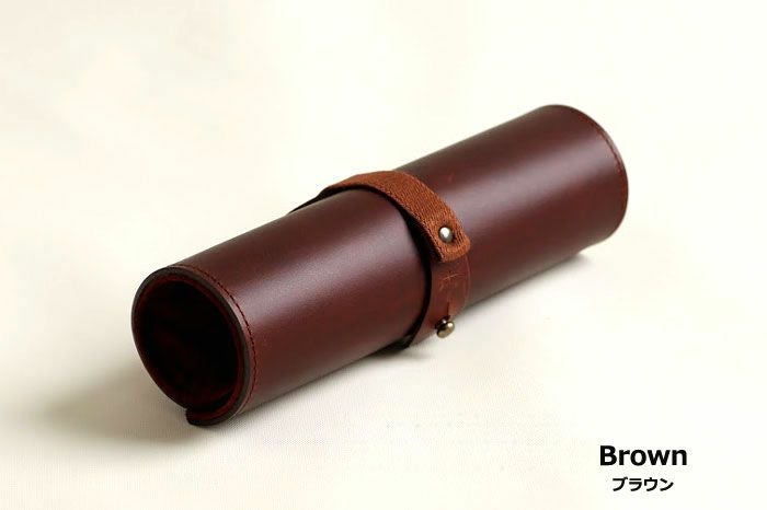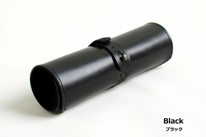 イタリア製タンニンなめしの一枚革を巻きつけて、ギボシで留めます。留め具の手前にゴムバンドを挟んでいるので大きさによらずしっかりホールド、ケース内でのガタつきを抑えられます。マチ部分にはピッグスエードを使っています。