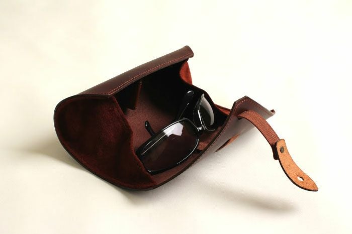 高さが45mmまでのメガネに対応、円筒型なのでラウンドしたサングラスなども収納可能。(大ぶりなものはレンズ面を手前に向けると仕舞いやすくなります)革の裏側はレンズ等を保護するために人工皮革スエードを貼ってあり、革製の鼻当てを付けています。