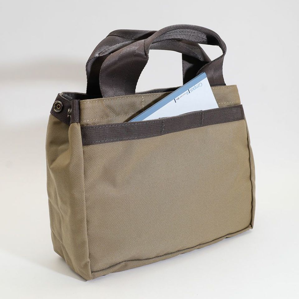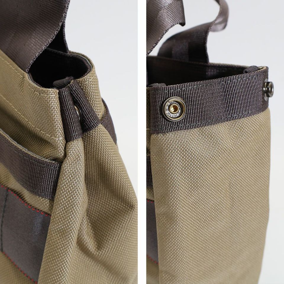 メイン収納部はマチ幅をしっかり確保し、見た目以上の収納力を発揮。さらに開口部の両側にスナップを備えており、荷物の量に合わせて間口を調節可能。使い勝手の良さを高めています。