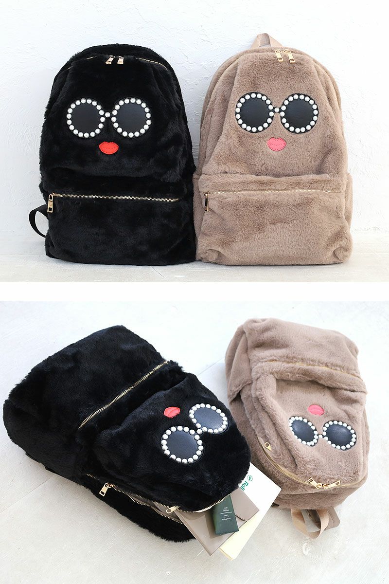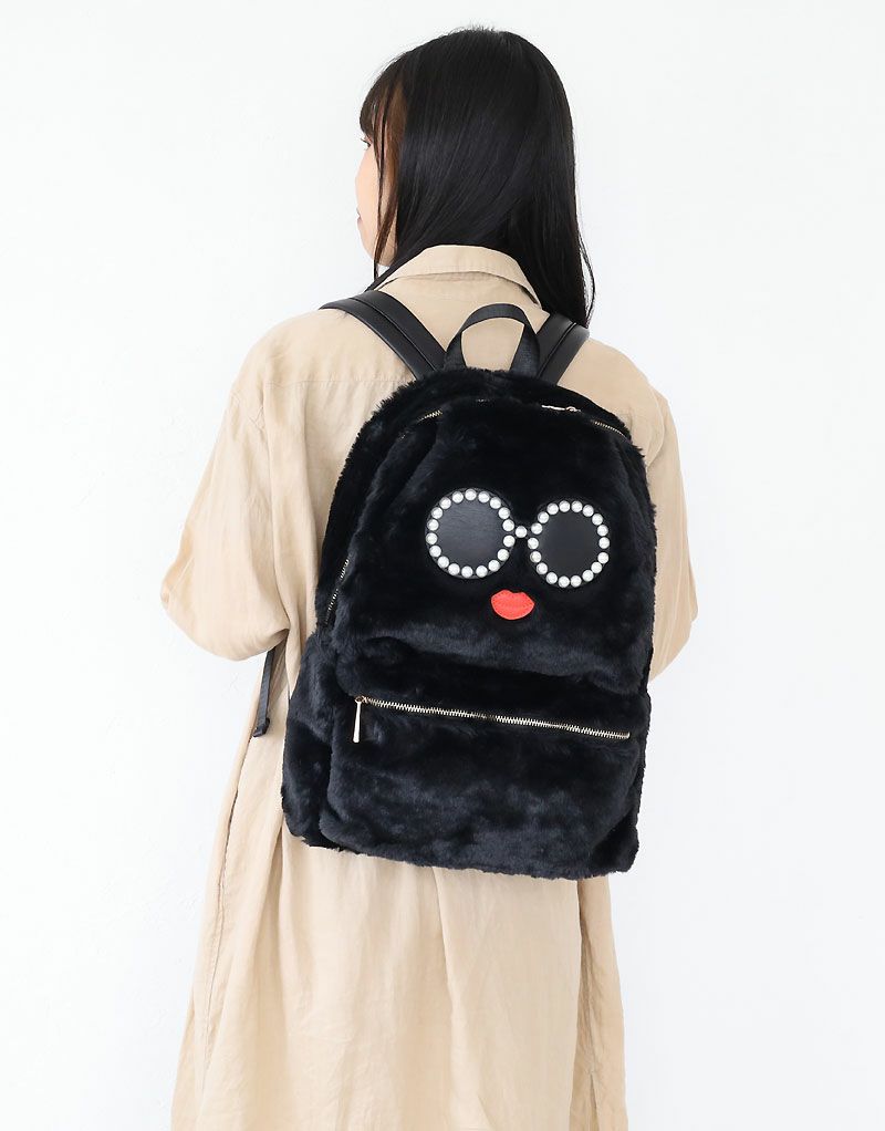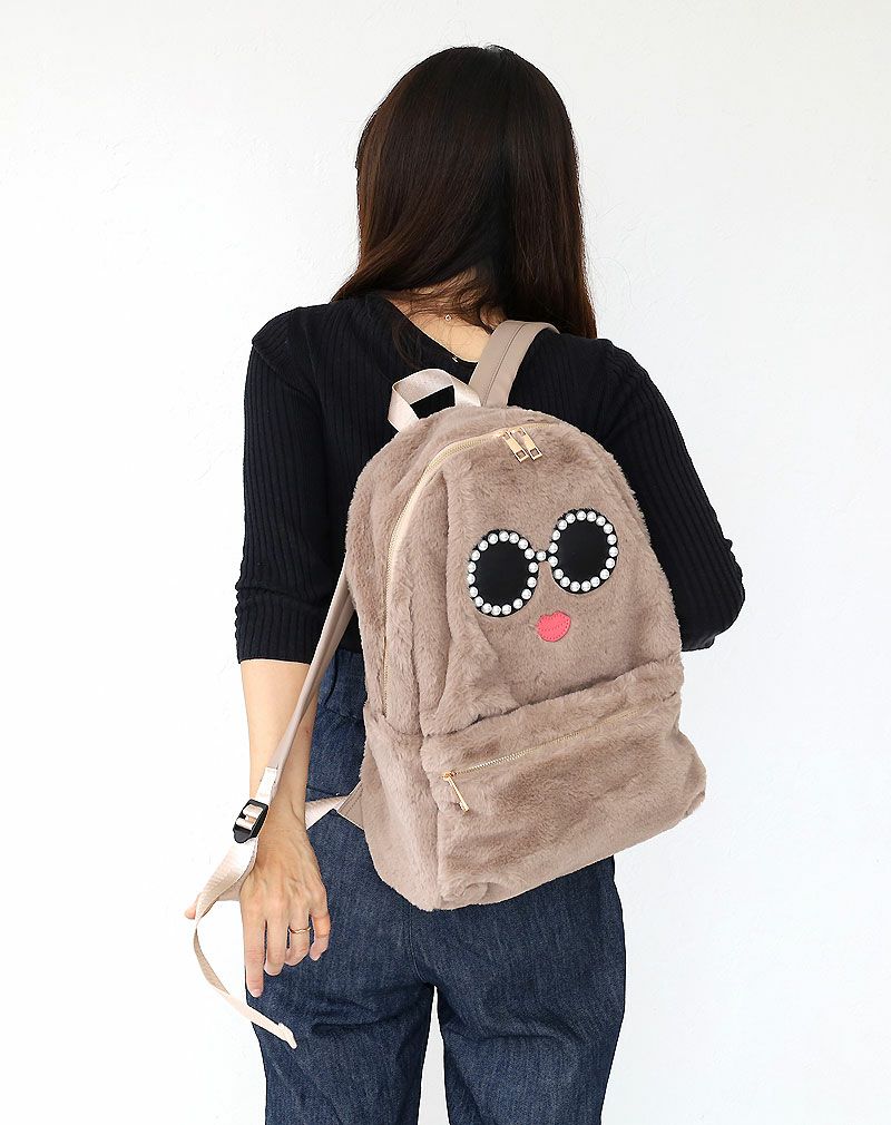 もこもこのフェイクファーにパールで縁取ったサングラスがとってもキュートな顔のデイパックです。
