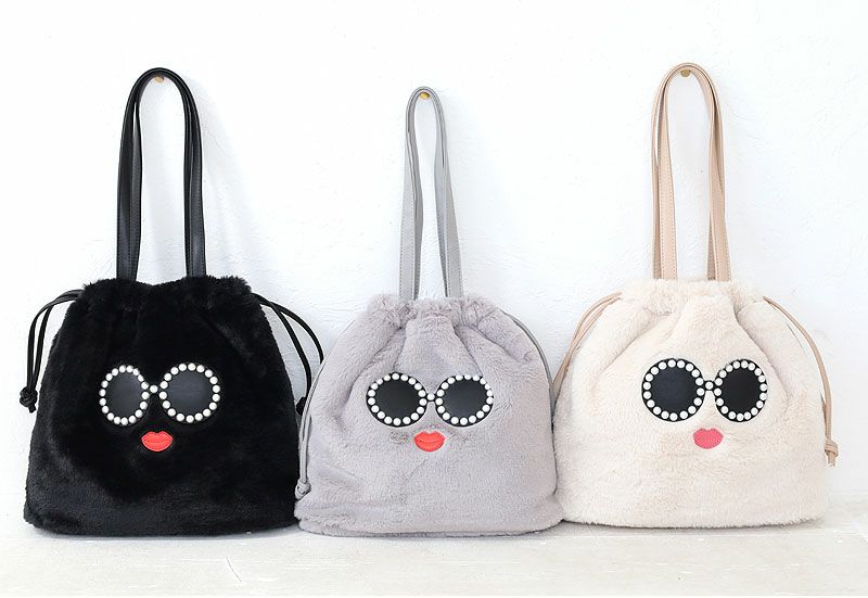 もこもこのフェイクファーにパールで縁取ったサングラスがとってもキュートな顔のハンドバッグです。