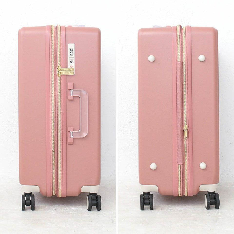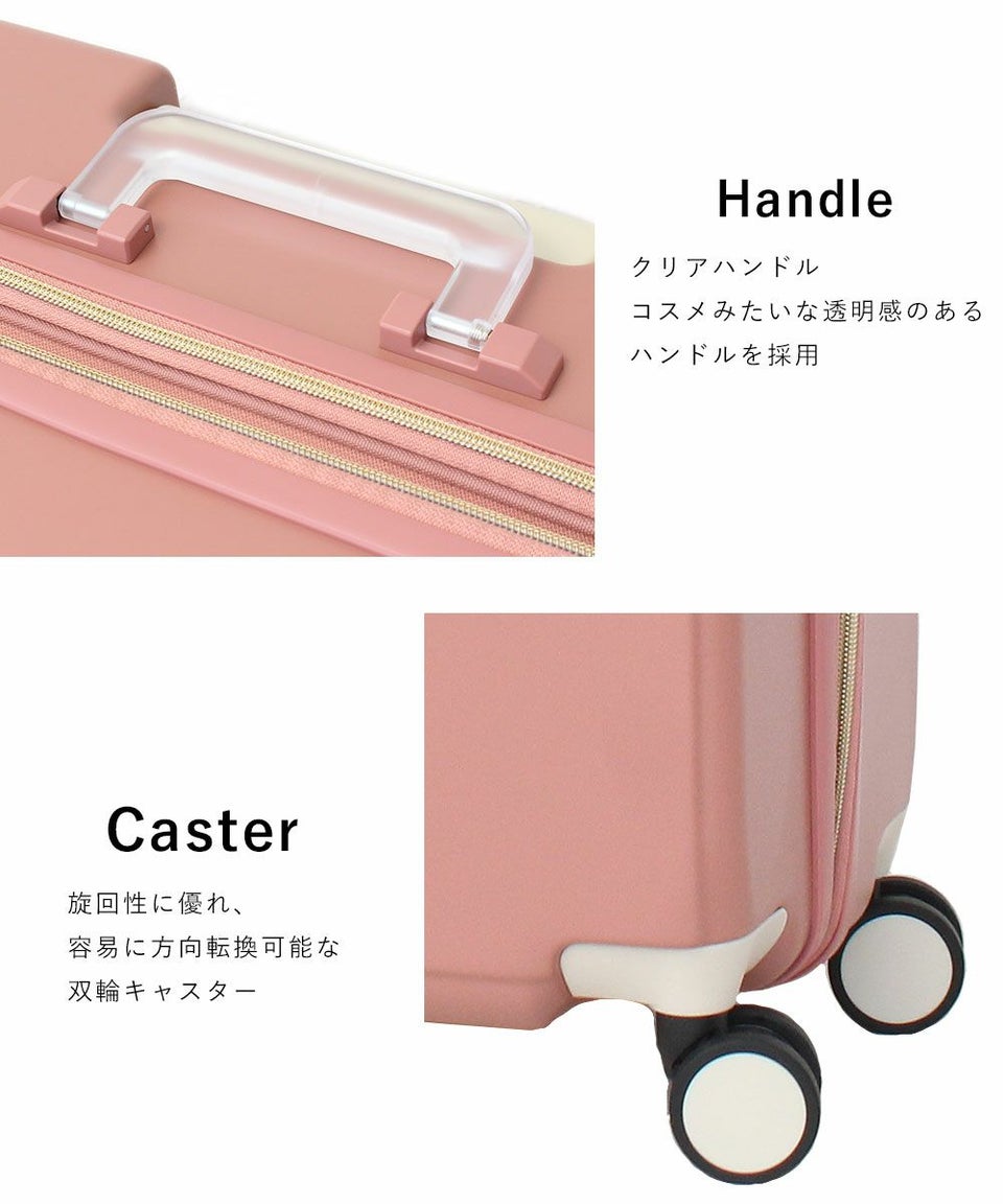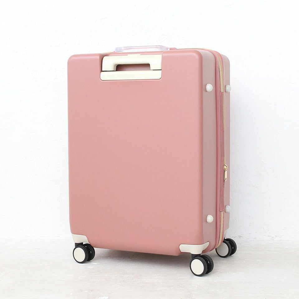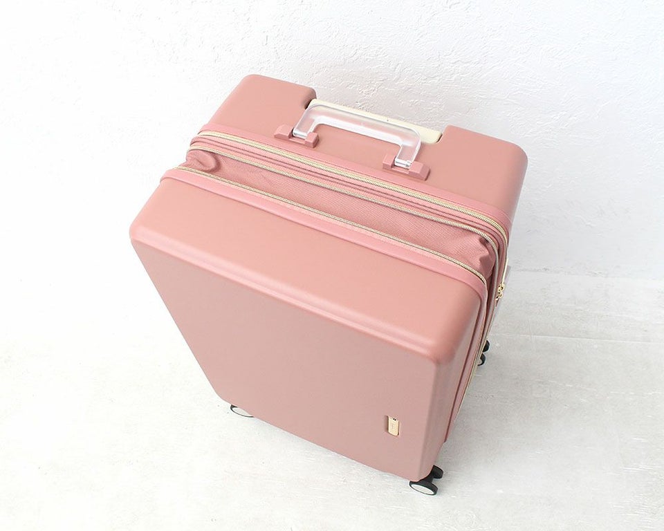 お洒落なニュアンスカラーの本体とクリアハンドルで抜け感のあるデザインに仕上げたジッパータイプのスーツケース。