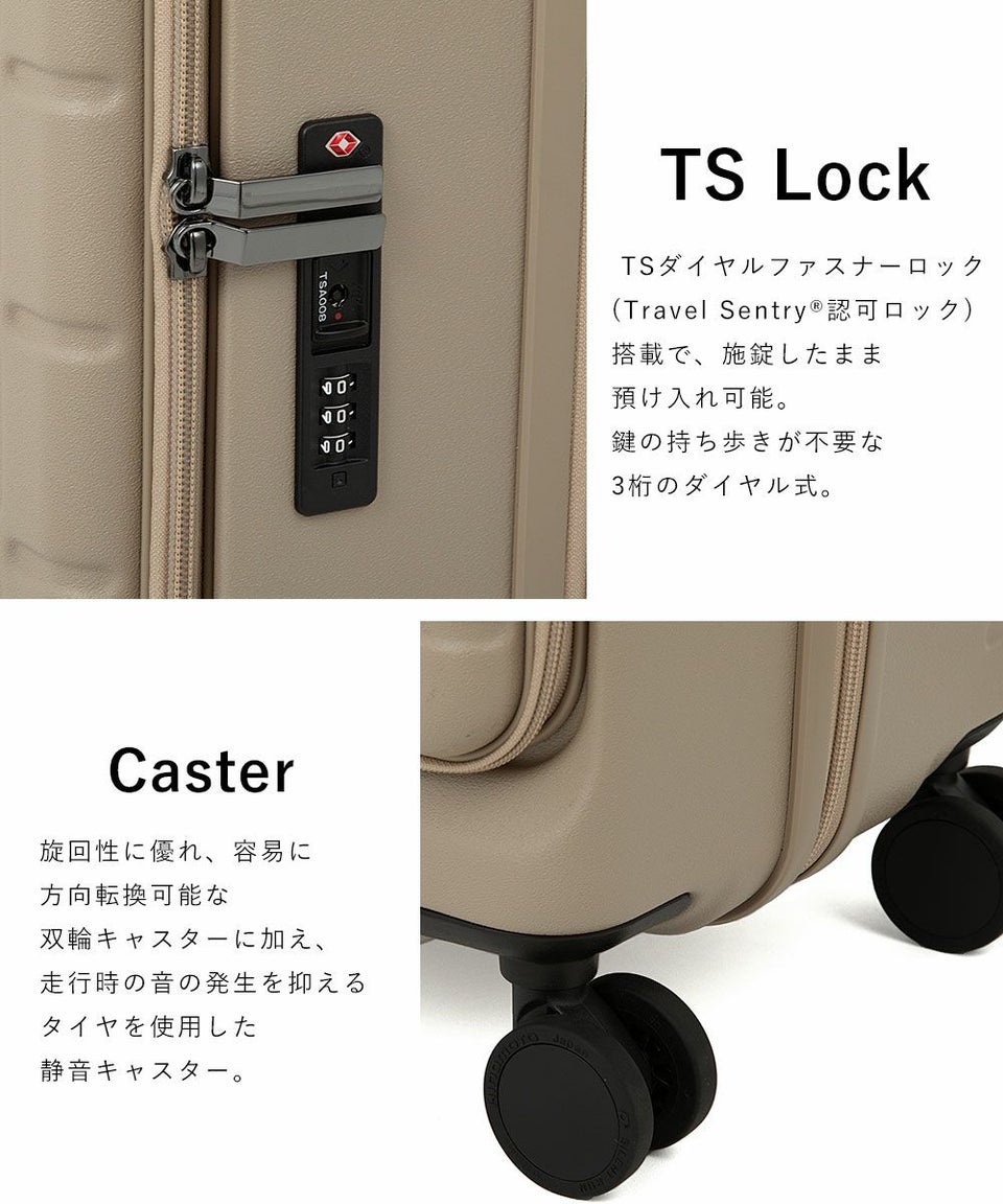 ●TSダイヤルファスナーロック: TSダイヤルファスナーロック(Travel Sentry(R)認可ロック)搭載で、施錠したまま預け入れ可能。鍵の持ち歩きが不要な3桁のダイヤル式。