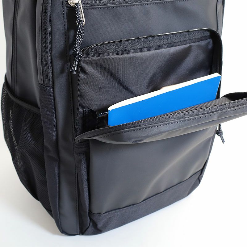 環境に配慮したリサイクルコーティング素材を採用し、耐久性にも優れています。 15.6インチのPCが入るクッション仕様のポケットもあり 様々なシーンに対応してくれます。