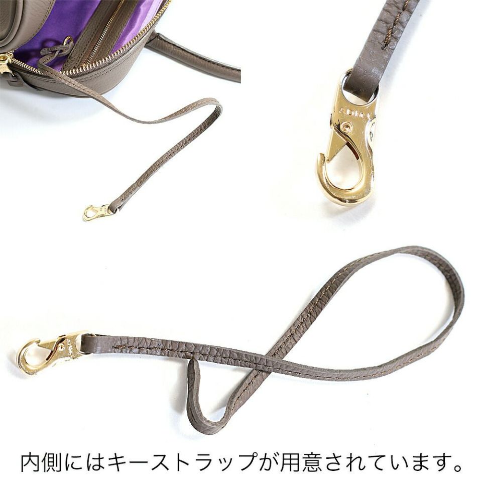 内側:メイン1室、ポケット3個(オープン1個、スナップボタン付1個、ファスナー付1個)、キーストラップ