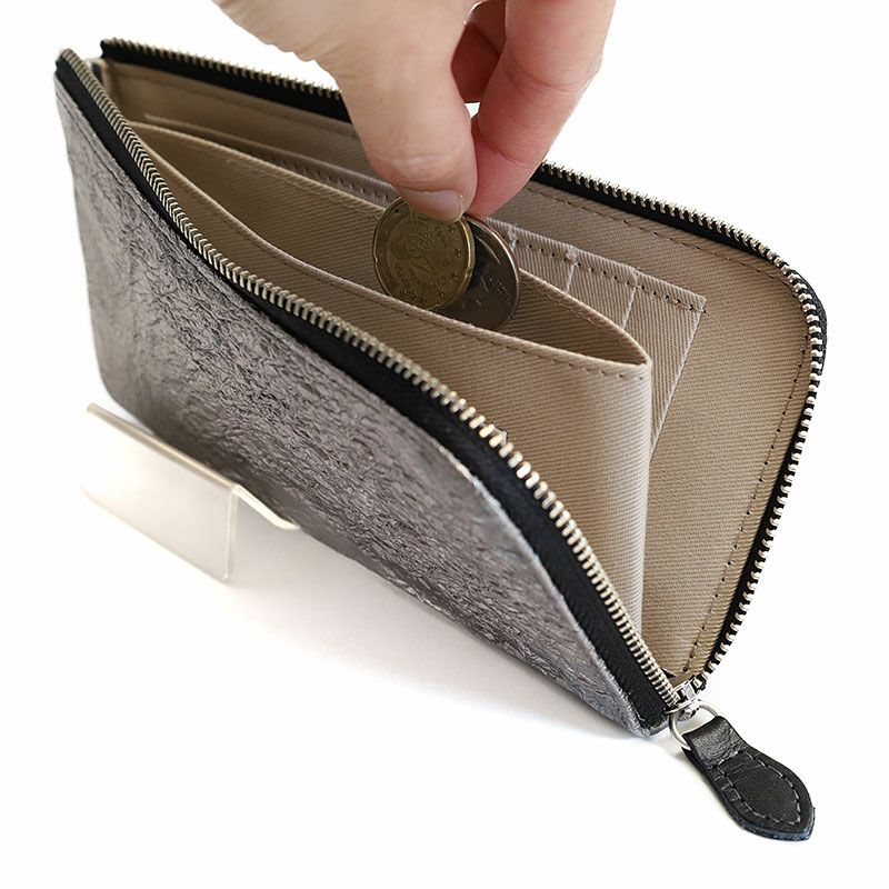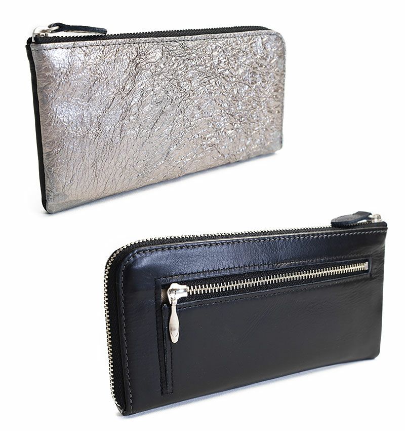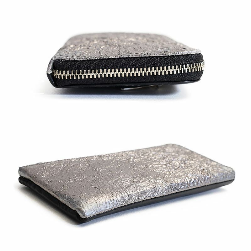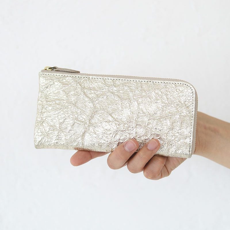 高級感のあるシルバー加工に塩縮加工を施したレザーで、インパクトのある長財布。