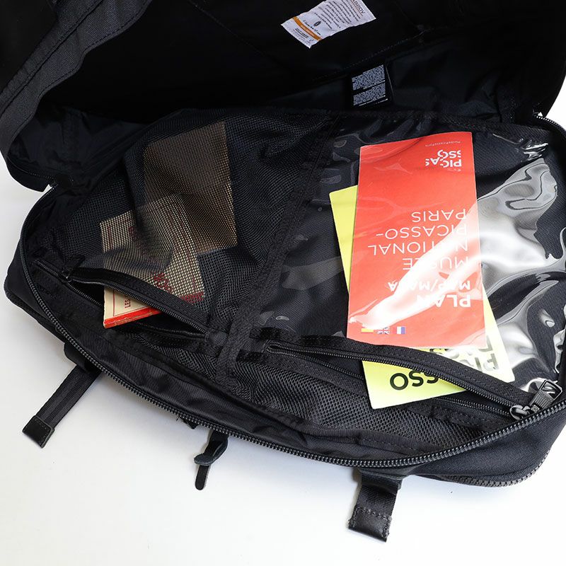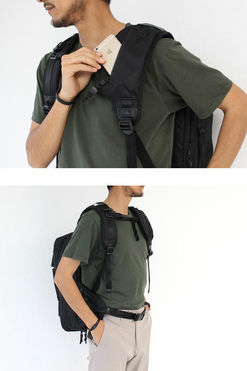 見た目はスタイリッシュですが、前面ポケットにはカードを専用で収納できる箇所があったり、カラビナが隠れていたりと、機能性の高さも備わっています。