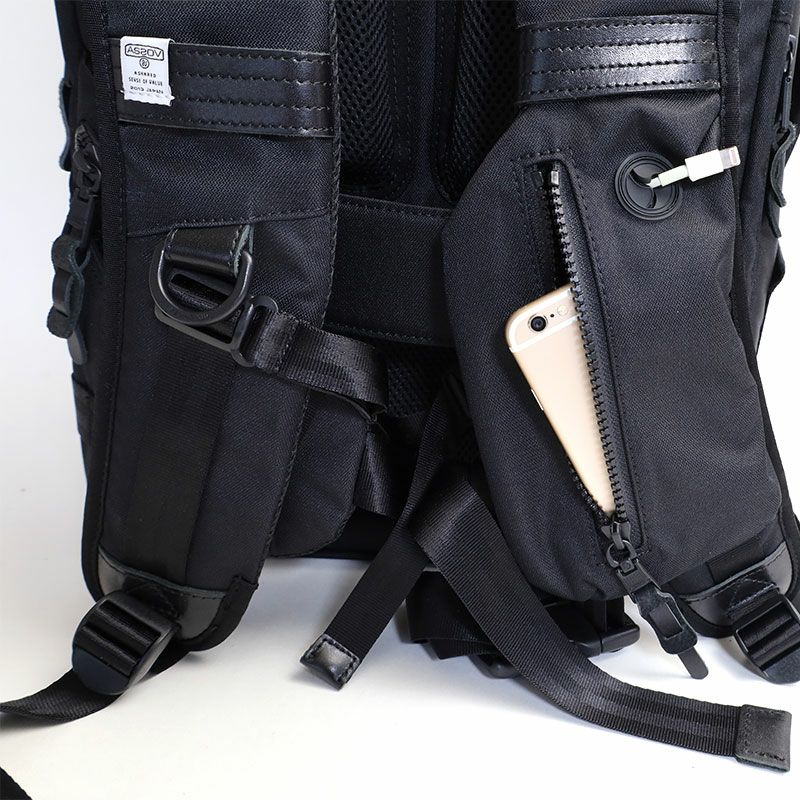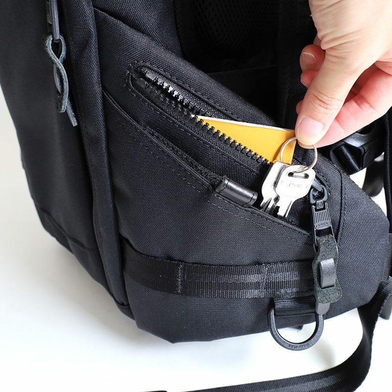 リュックベルトに携帯や鍵など素早く出し入れできるファスナポケットが備わっています。