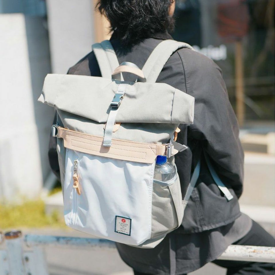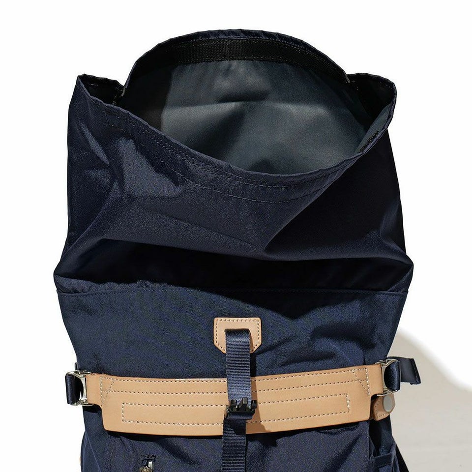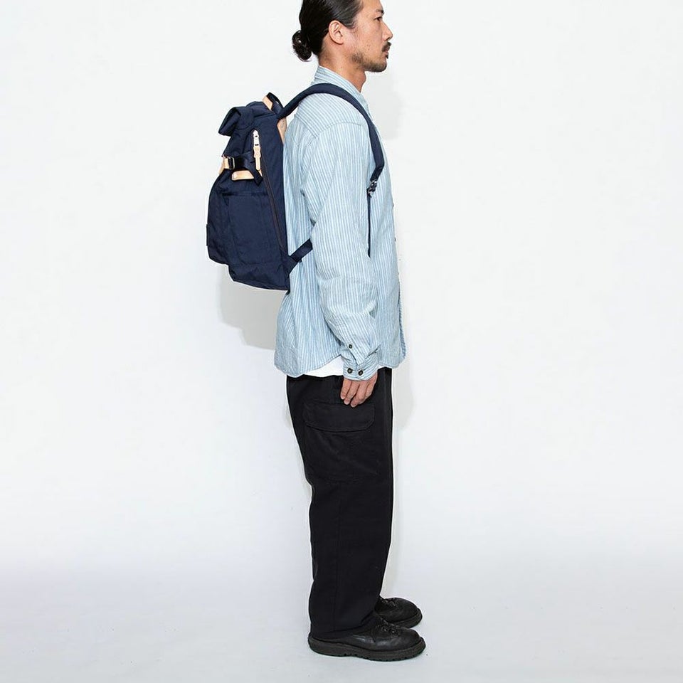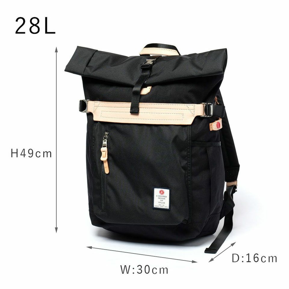 前面のレザーのワンポイントが印象的なロールトップ型、2泊分の荷物も入る大容量バックパックです。