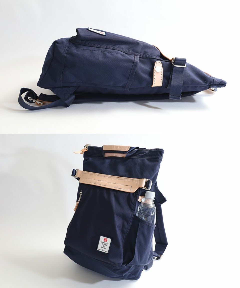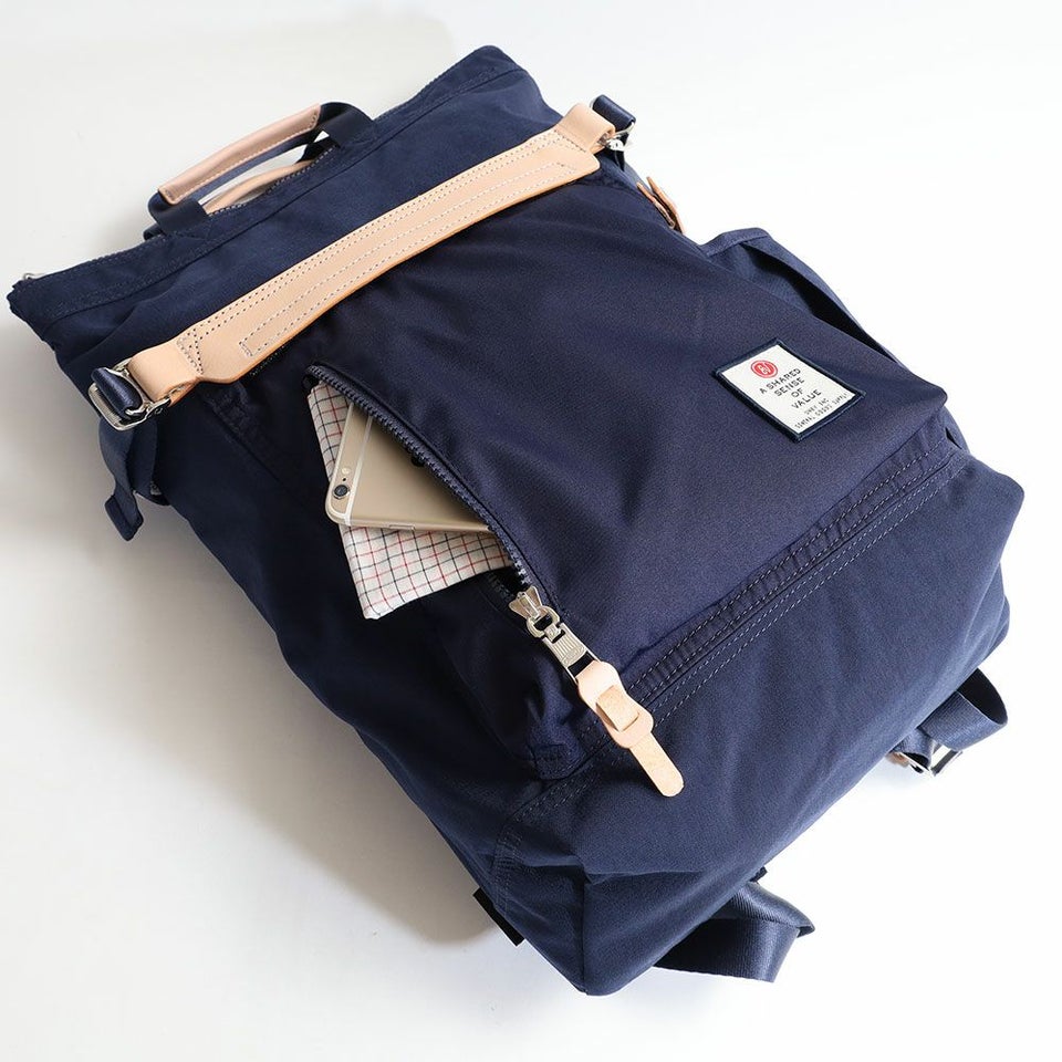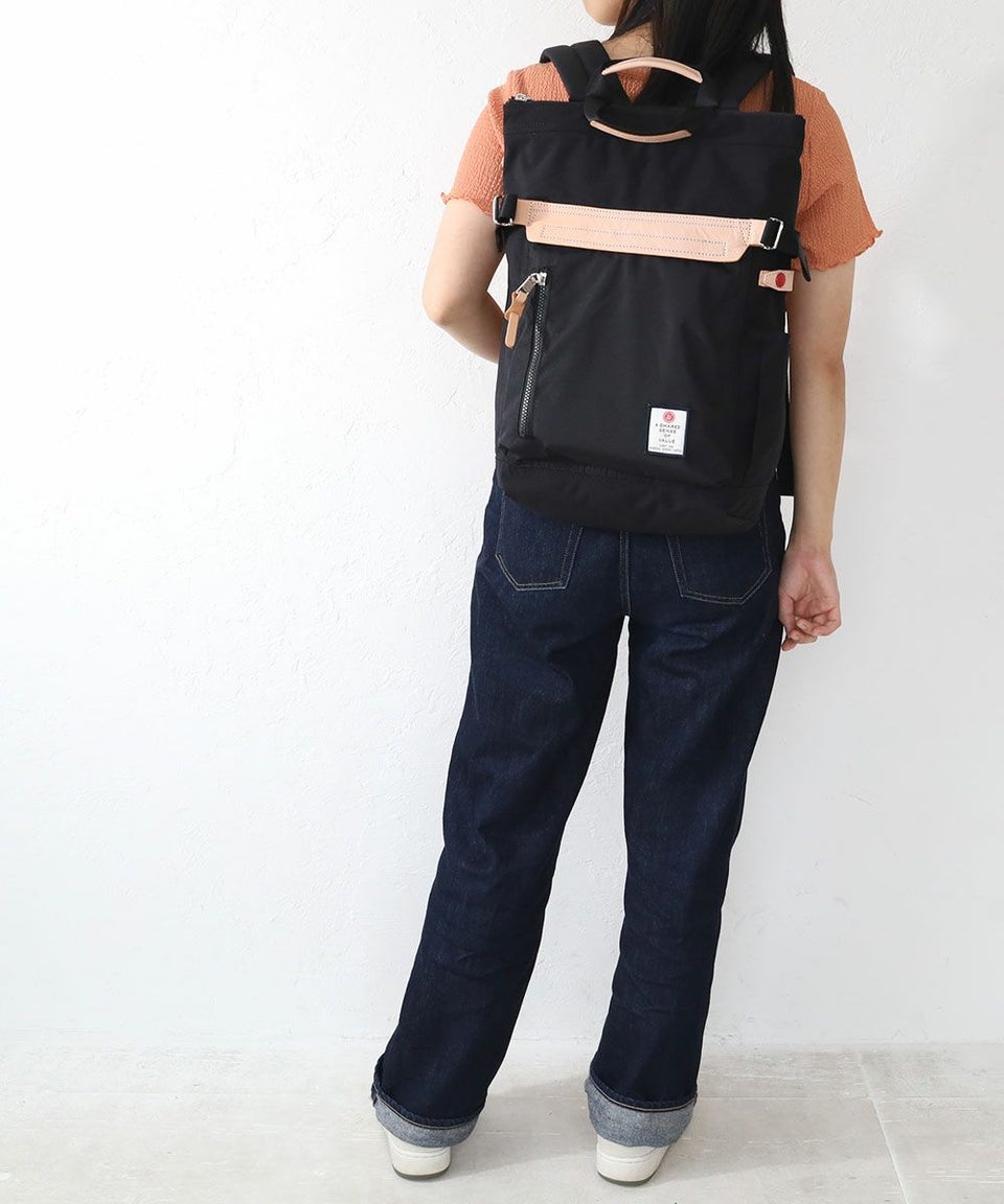 前面のレザーのワンポイントが印象的なバックパック・手持ちの2WAYのバックパック。