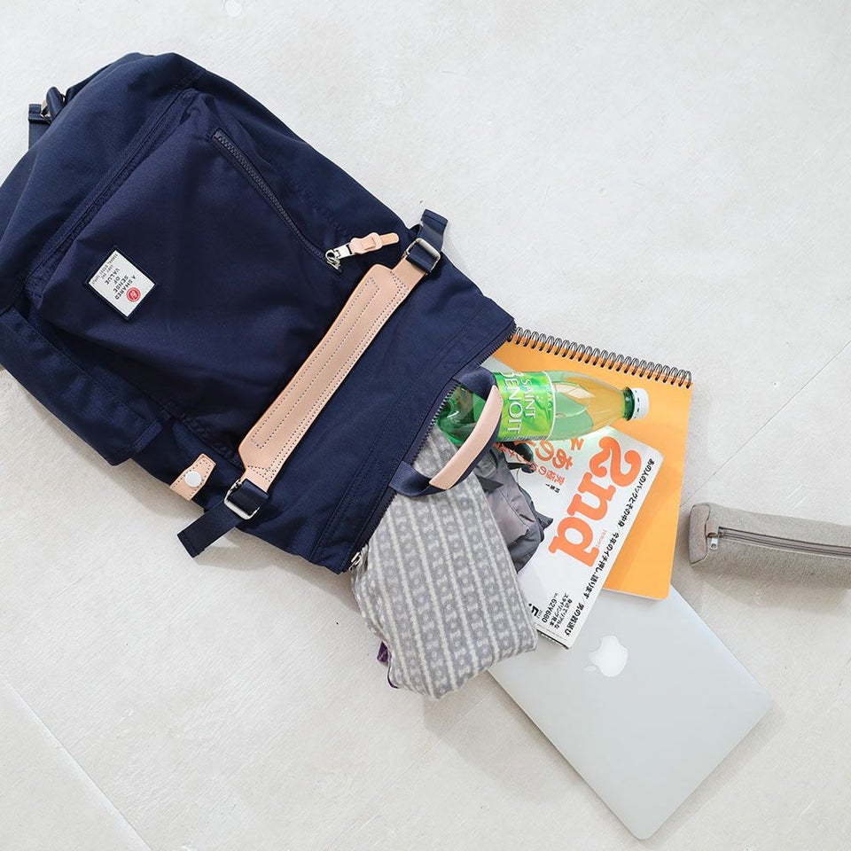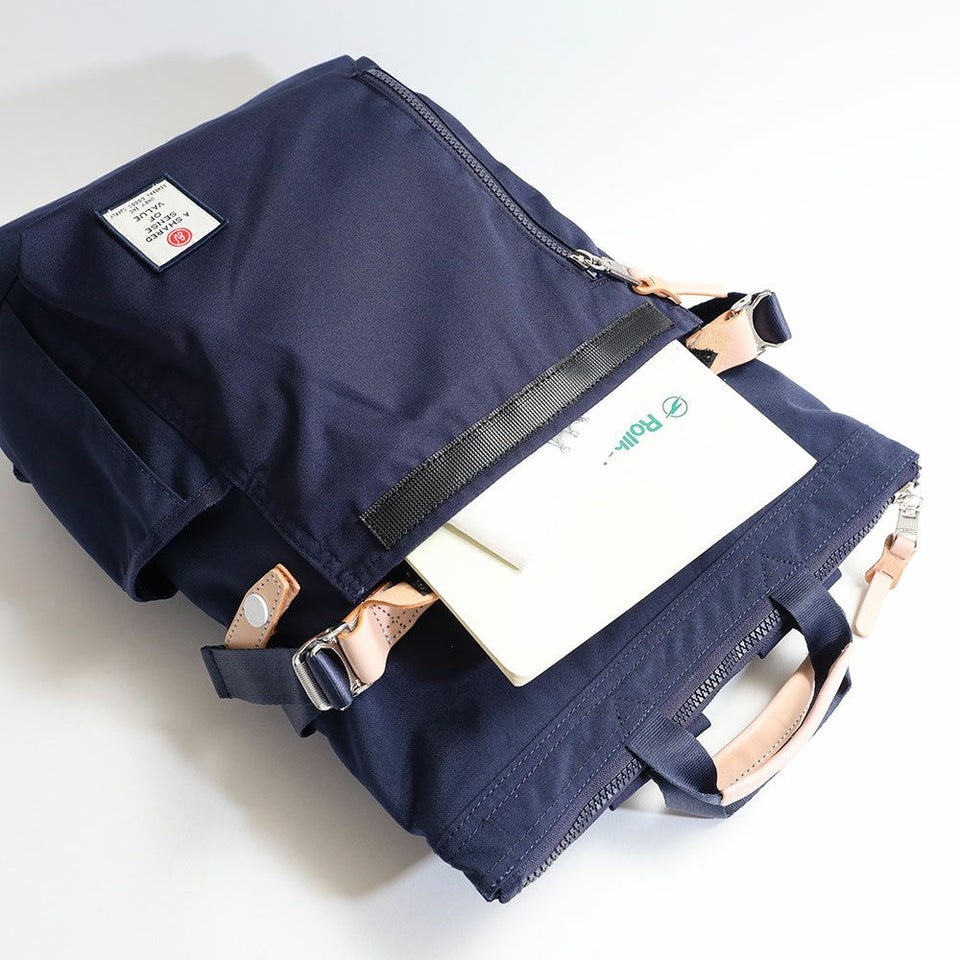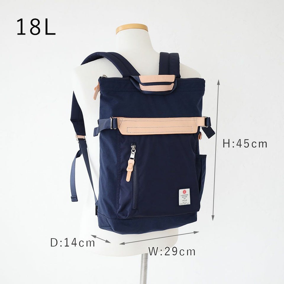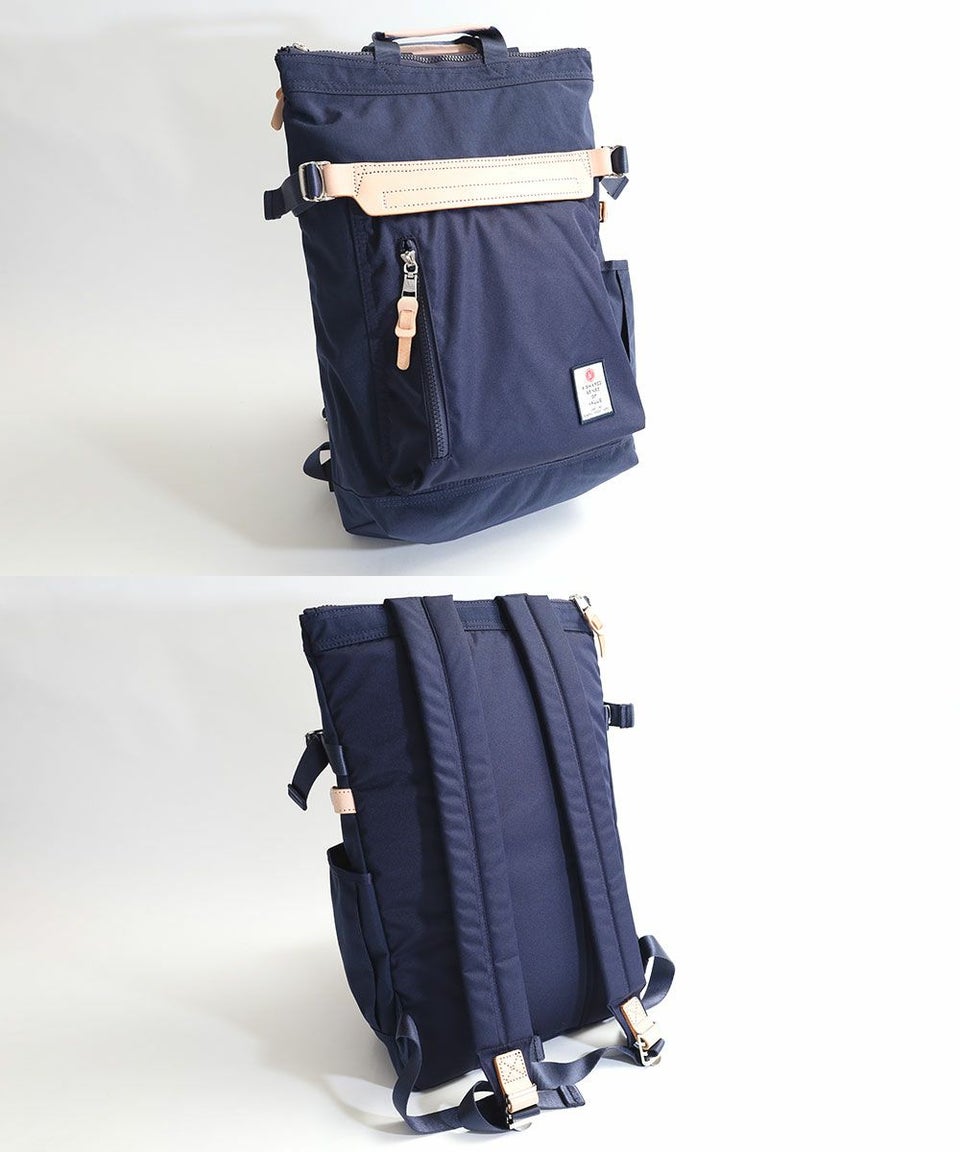前面のレザーのワンポイントが印象的なバックパック・手持ちの2WAYのバックパック。
