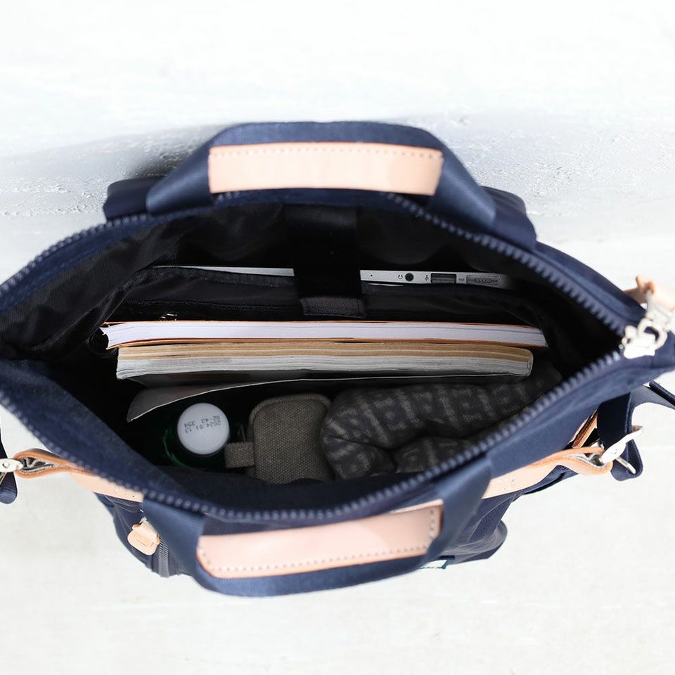 16インチ(Macbook基準) 対応のラップトップスリーブ内蔵。ファスナーポケットもあり、小物などを収納できます。