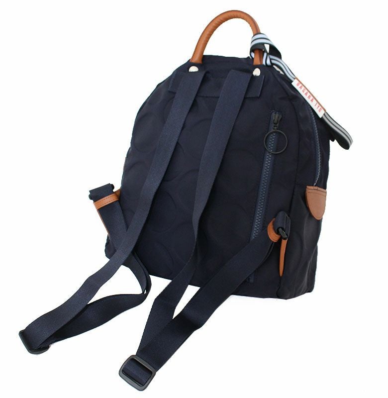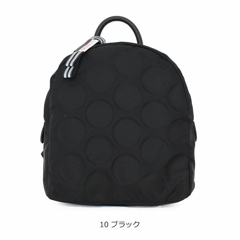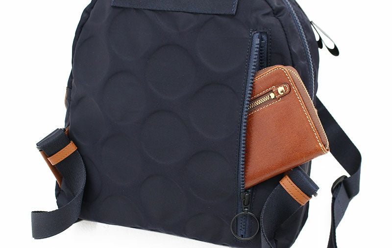 外側背面に縦型のジッパーポケット付きで、背負ったままでも手を回せば出し入れができます。トップにハンドルが付いてるので手に提げて持つことも可能。小ぶりですが底マチもしっかりあり、見た目以上に収納力があります。