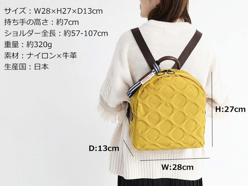 一番の特徴は驚く軽さ。福井の繊維技術が詰まったナイロン素材は軽い、強い、撥水性に優れています。そのナイロンにディボック加工という凸凹のドットの型押しを施し、スポーティーでありながら優しいフォルムに仕上げました。サラッとした柔らかな素材なので着用した際も身体に寄り添うようになじみストレスがありません。