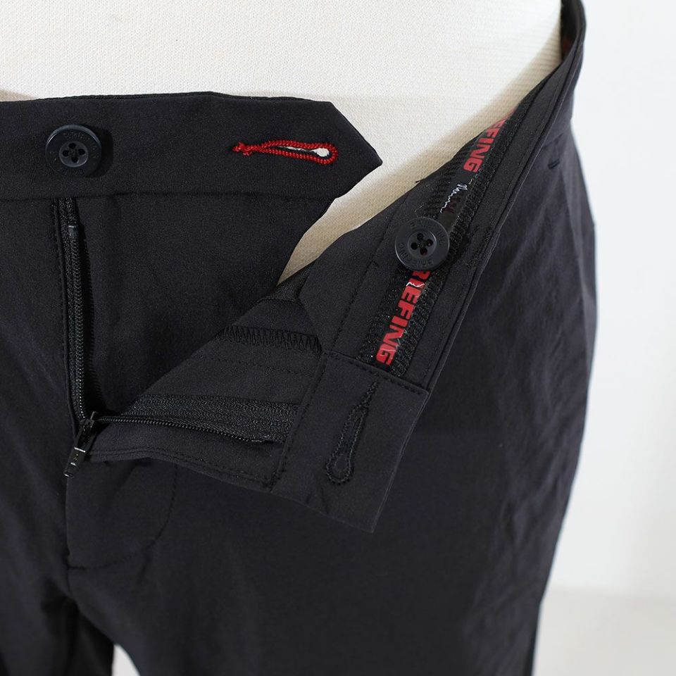 裾リブ仕様で動きやすく、スポーティな印象を持ちつつ、ポケット周りなどにはスラックスのディテールを取り入れて上品な表情をプラス。カジュアルになりすぎず、大人のゴルフスタイルにフィットします。