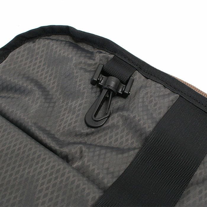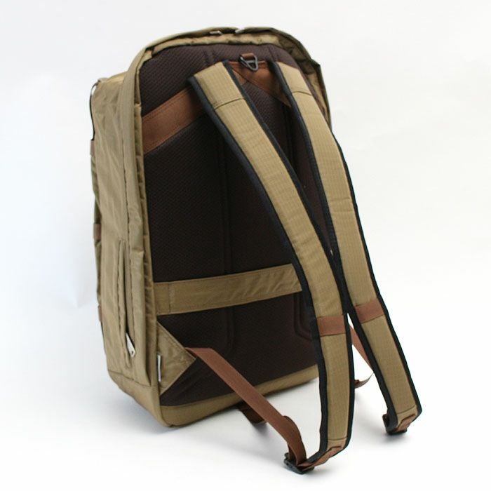 メイン開閉のファスナーは背面側にファスナー口がついていますので、普通のバックパックよりも防犯面に優れています。背面ハーネスはループベルトを通して、簡易的に収納可能になっており、シーンに併せて横持ちで使用できます。