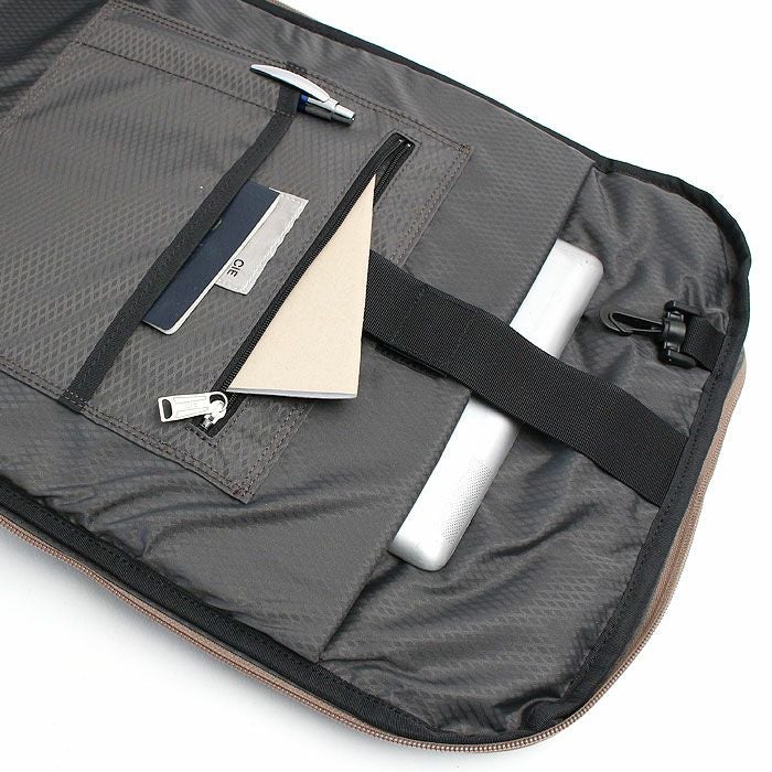 メイン開閉はバッグの底近くまで大きく開くので、荷物の出し入れがしやすくなっています。内装はPCの収納に最適なPCポケットの他に、オープンポケット、ペンホルダー、ファスナーポケット、さらに鍵をかけてくためのキーフックがついており、使い勝手の良い機能がそろっています。