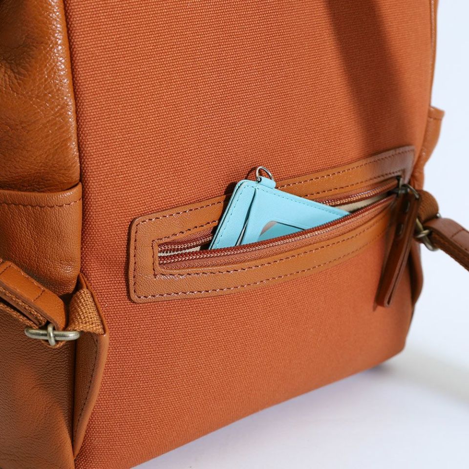 背負ったままでもアクセスしやすいアウトポケットを複数配置。さらに、ペン挿しなど細かい仕切りも充実しており、旅行や外出先でもサッと必要なものを取り出せる、頼れる機能派リュックです。
