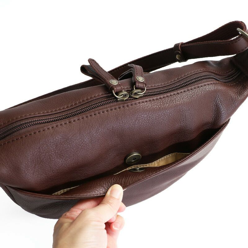 可愛らしさのある丸形の金具がポイント。ショルダー紐は調節金具で微調整が可能です。