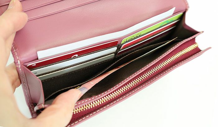 手前にL字ファスナー式の小銭入れが配置されており、中は蛇腹の二層で小銭が見やすく取り出しやすいつくりになっています。