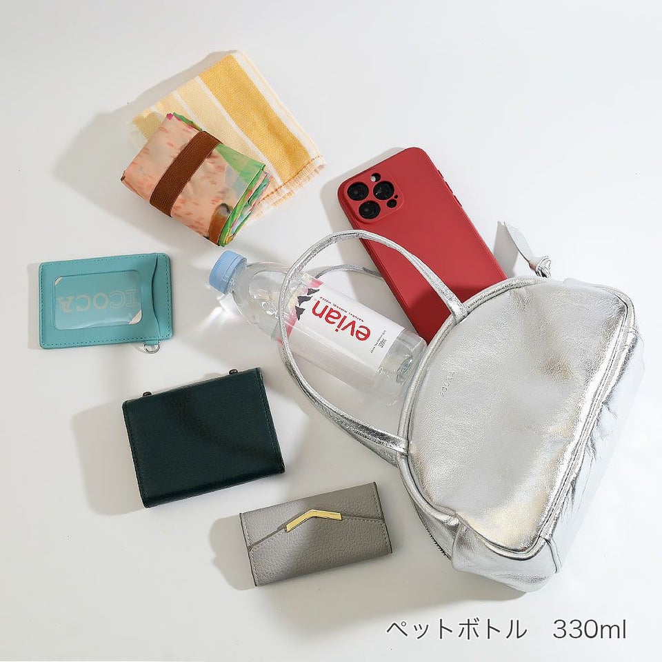 二つ折り財布にスマートフォン、ポーチなどの外出の際の必需品がコンパクトに収まるサイズ感。