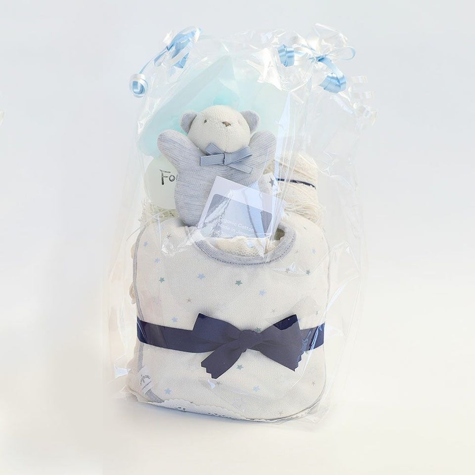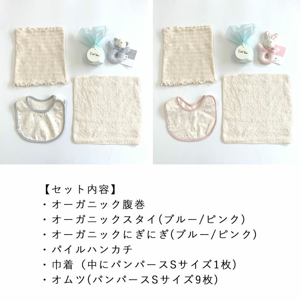 オーガニック腹巻、オーガニックスタイ、オーガニックにぎにぎ、パイルハンカチとSサイズのおむつ10枚のセット。